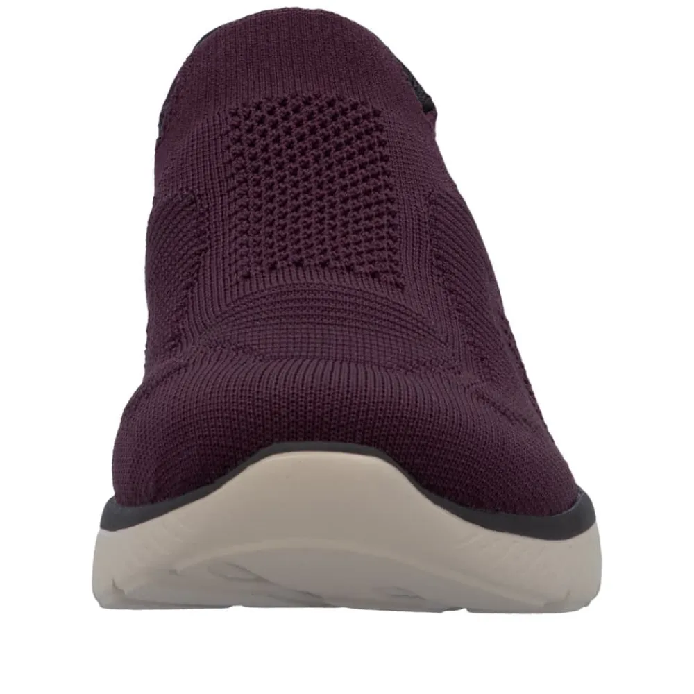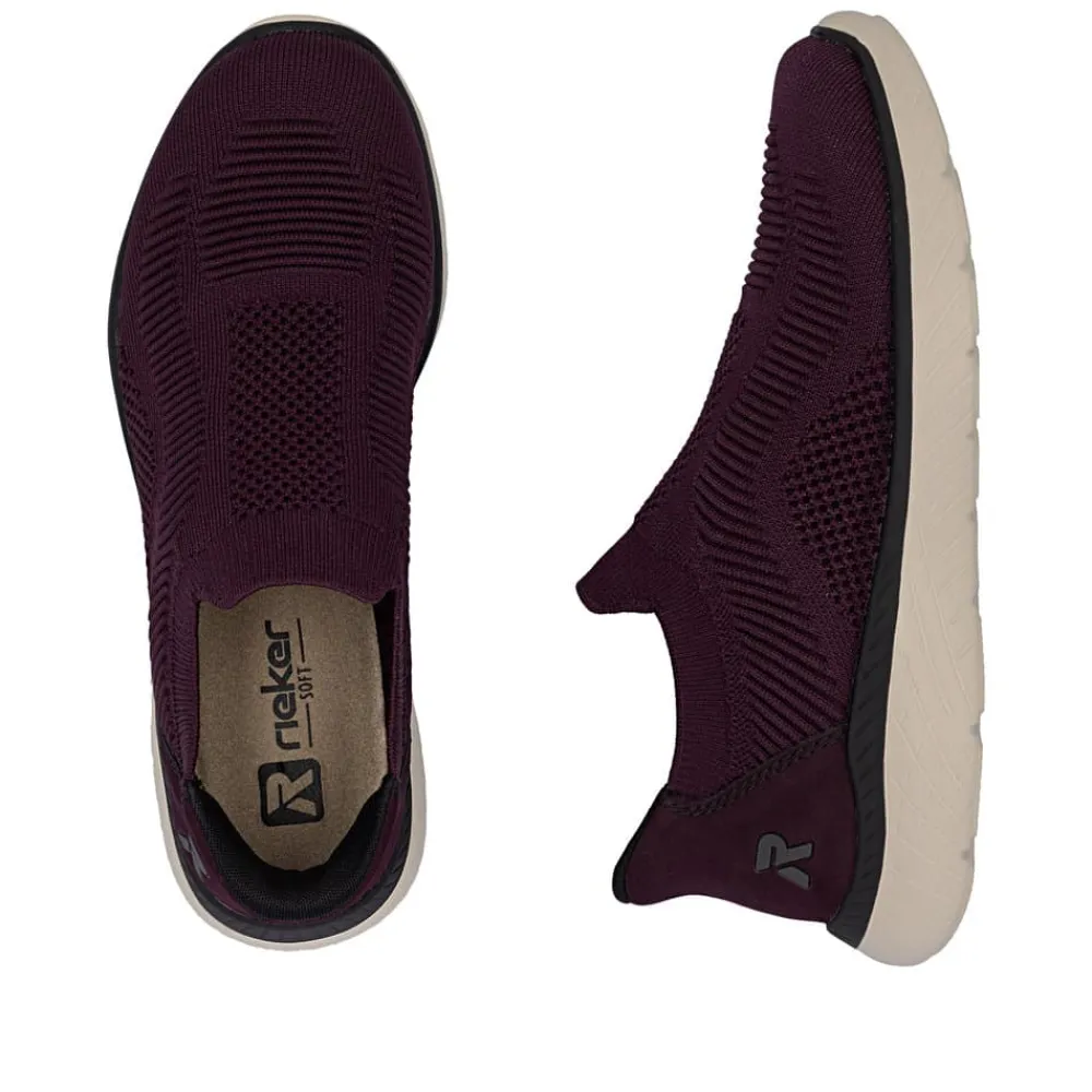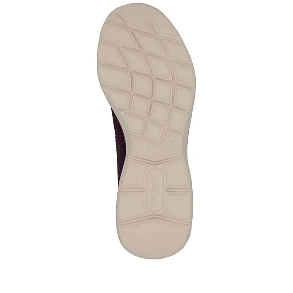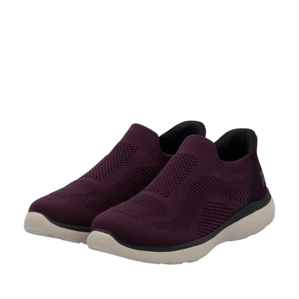 Rieker Ready 2 Go sko til dame i bordeaux. Denne sko er skabt til dig, der ønsker en praktisk løsning med høj komfort. Med Ready 2 Go teknologien og en fast hælkappe kan du tage skoen på uden brug af hænder. Rieker Antistress gør modellen let og fleksibel, så den føles behagelig, selv efter mange timers brug. Indvendigt finder du en memosoft-sål, som former sig efter foden og giver støtte hele dagen. Ydersålen er udstyret med et mønster, der både øger stødabsorbering og skridsikkerhed