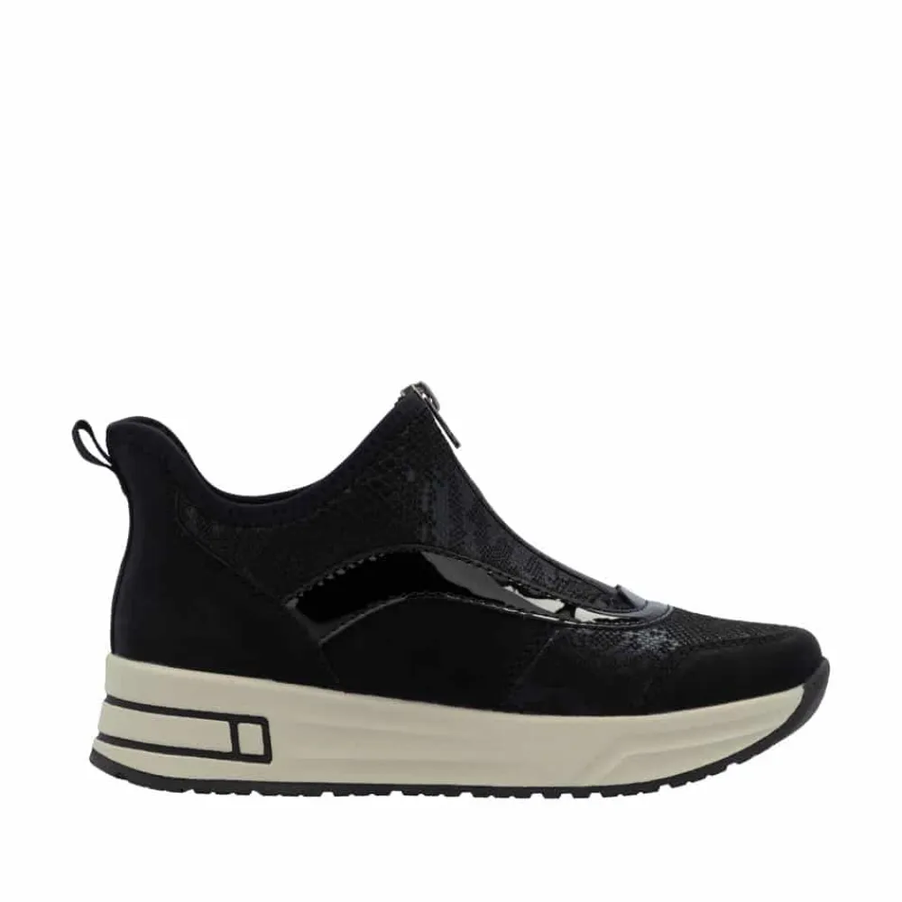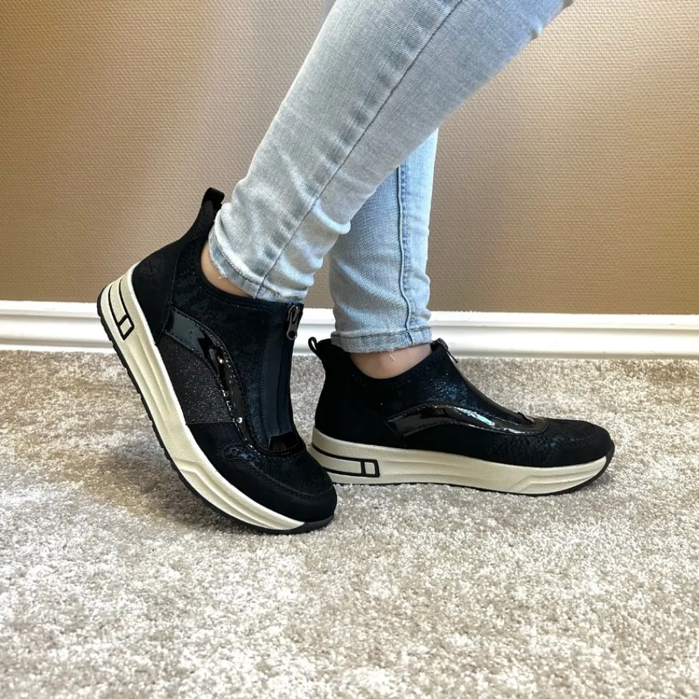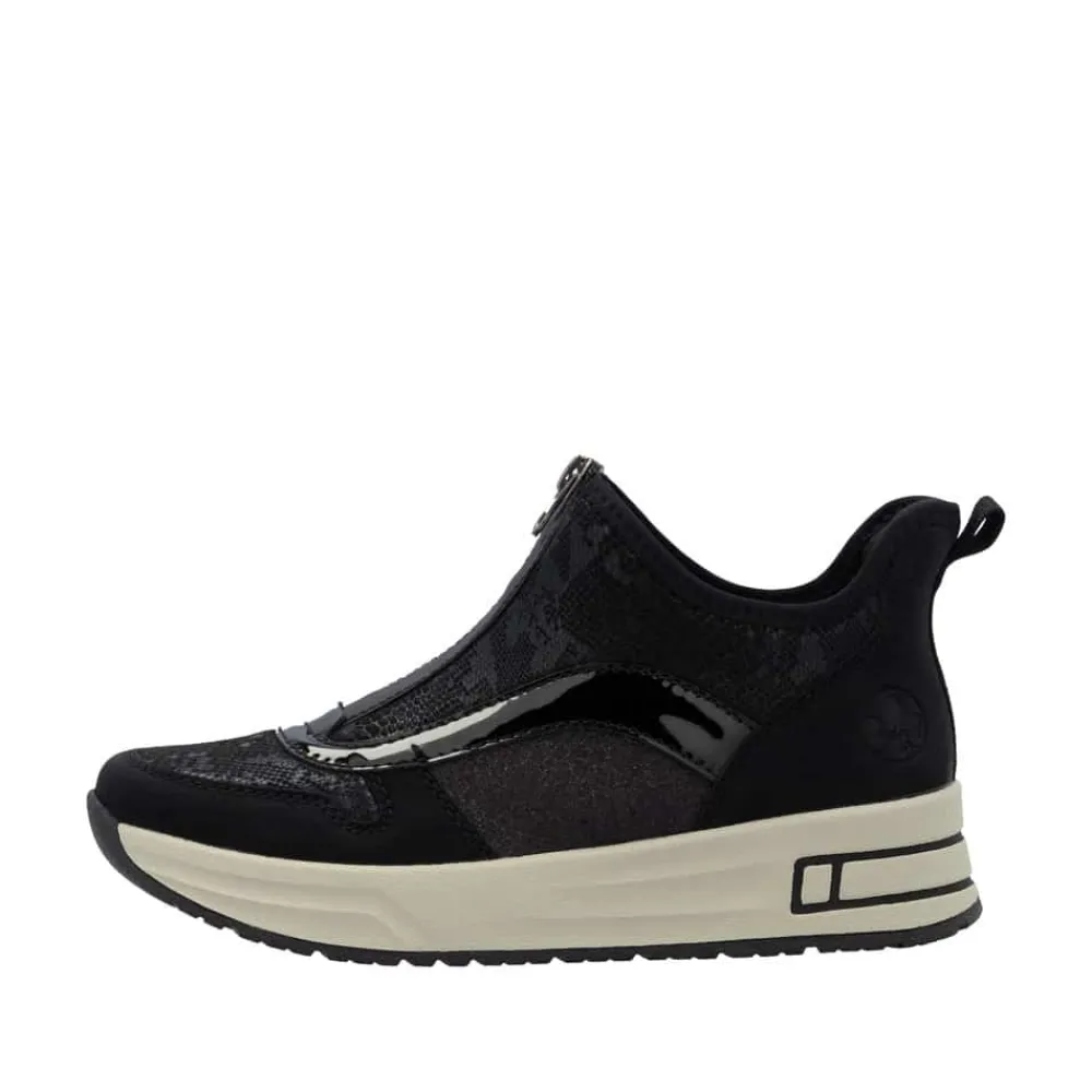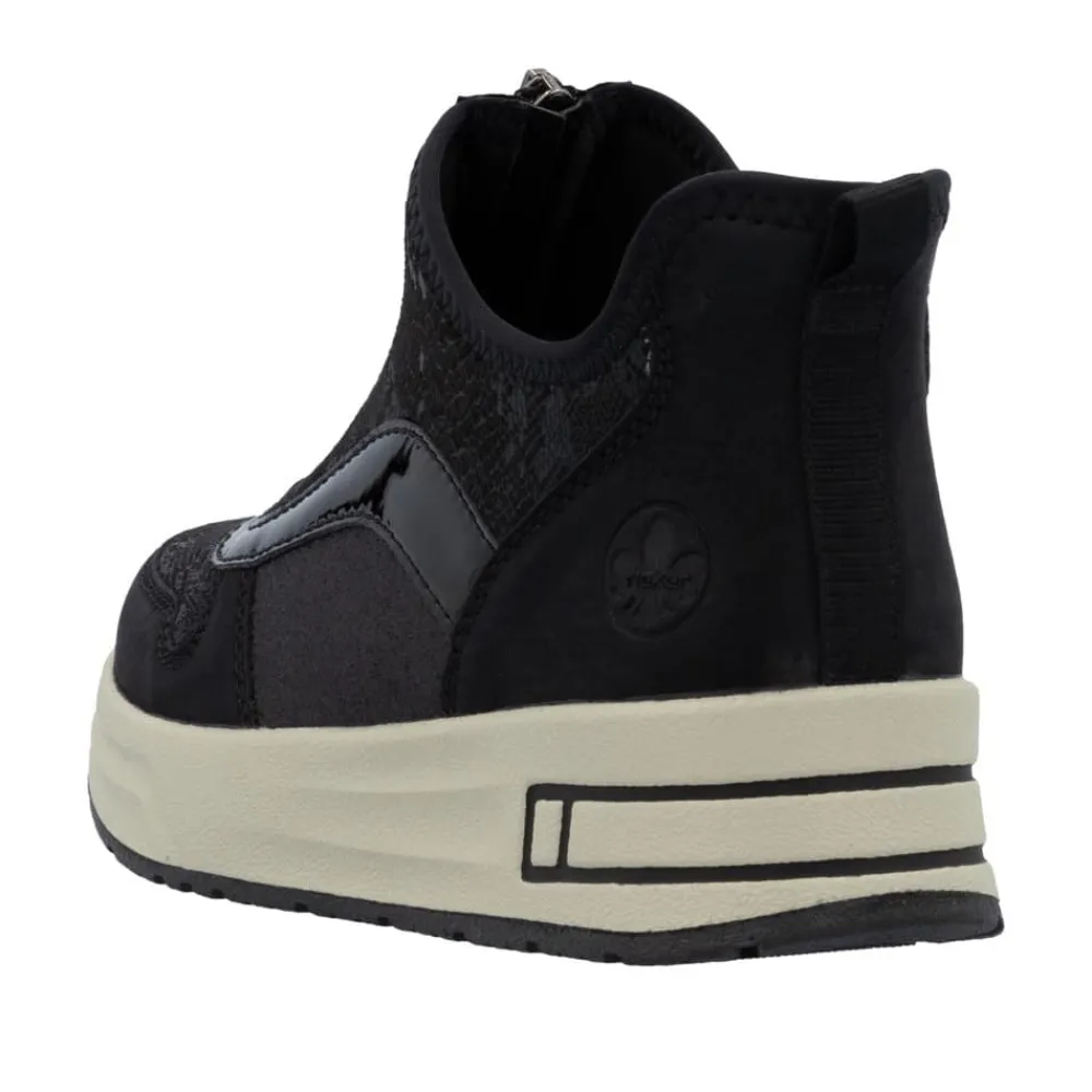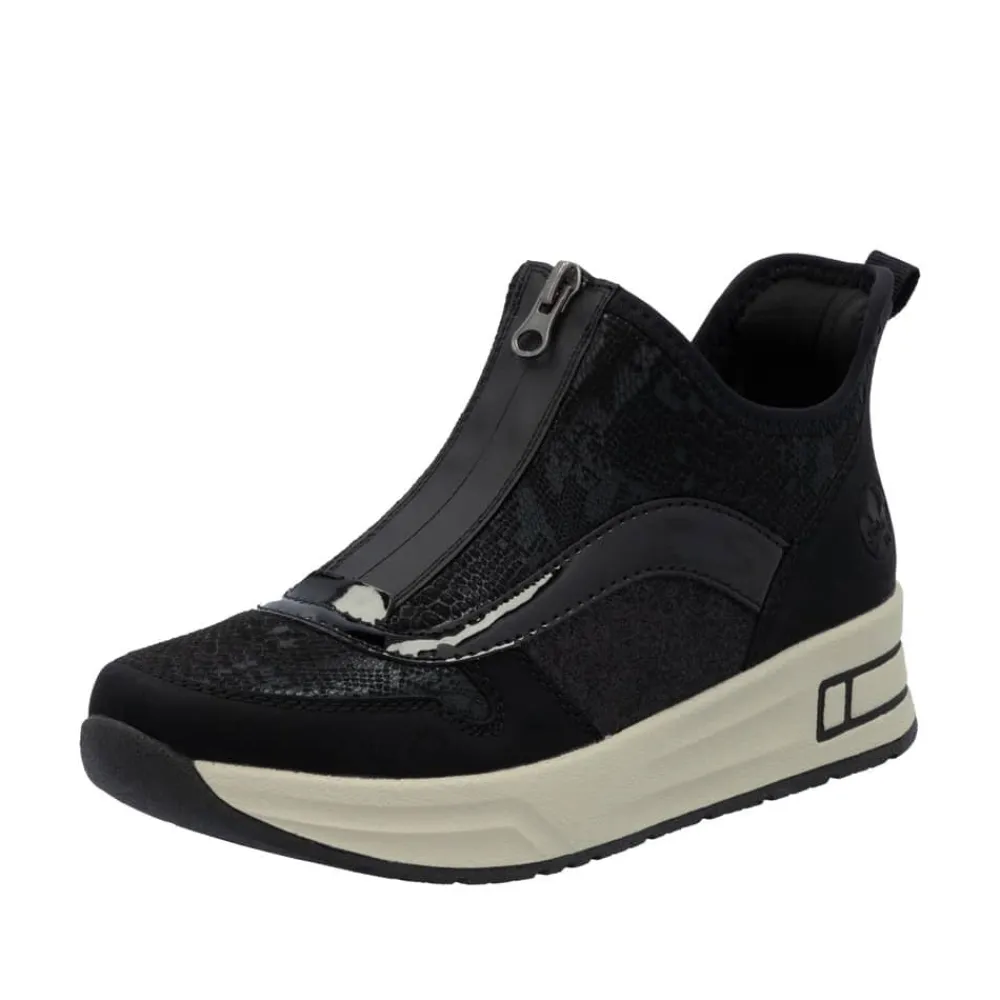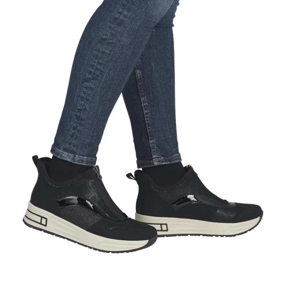 Rieker Ready 2 Go støvle til dame i sort. Denne støvle kombinerer stil og komfort på bedste vis. Med Ready 2 Go-teknologi og en fast hælkappe kan du tage støvlen på uden at brug af hænder. Foran finder du en funktionel lynlås, som både er praktisk og tilføjer en smart detalje. Indvendigt bliver du mødt af en blød udtagelig sål og ekstra bredde (H), der sikrer en rummelig pasform og høj komfort hele dagen. Den mønstrede ydersål giver øget stødabsorbering og skridsikkerhed.