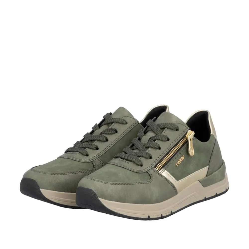 Rieker sneakers til dame i grøn. Let og fleksibel sneakers i en flot grøn farve med smarte detaljer, der giver et feminint udtryk. Skoene har både snørebånd og en lynlås i siden, så de er nemme at tage af og på. Indvendigt finder du en blød og udtagelig indersål, der giver komfort hele dagen. Den lette ydersål med Rieker Antistress-teknologi sikrer, at skoene er behagelige at bruge i hverdagen.
