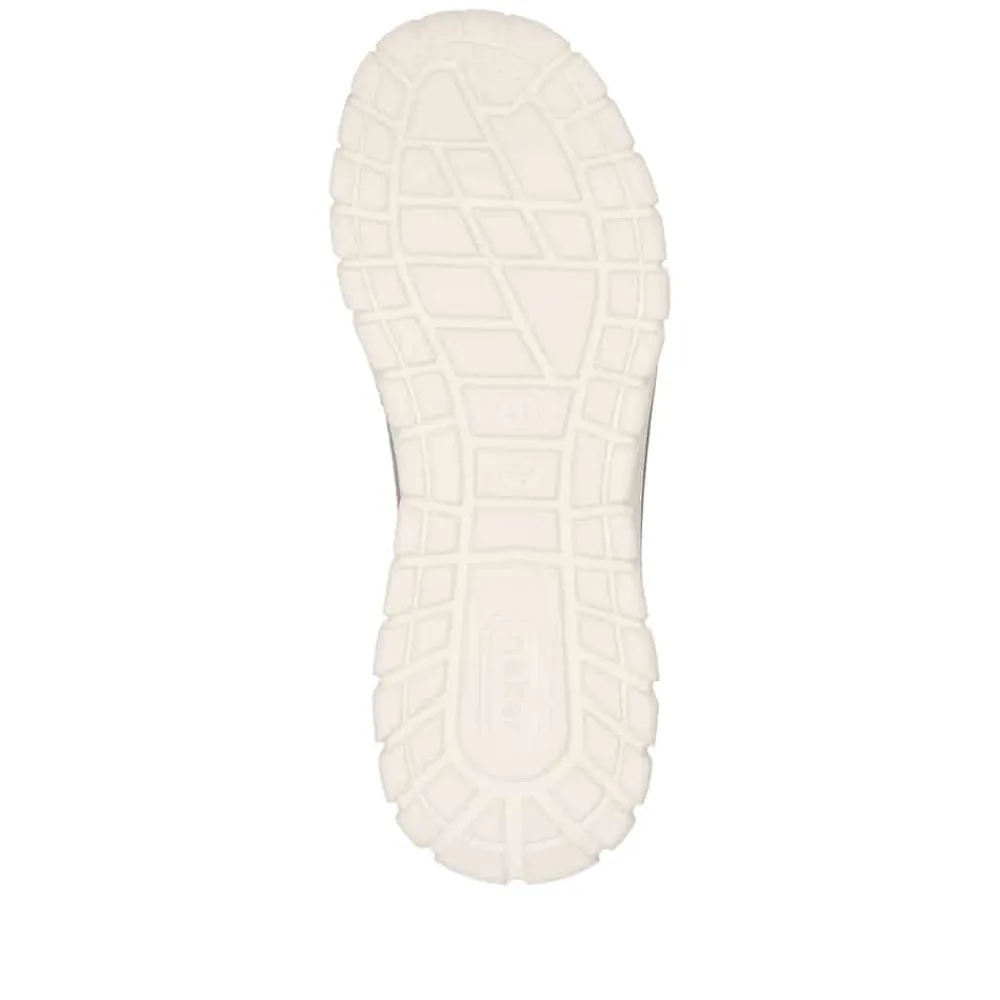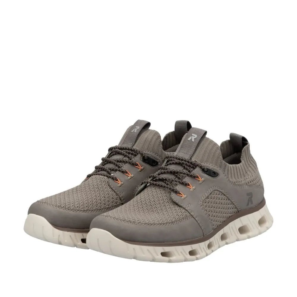 Rieker sneakers til herre i beige/brun er en let og fleksibel sko, der kombinerer komfort og et moderne look. Overdelen er fremstillet i åndbart tekstil, som sikrer en behagelig pasform og giver et stilrent udtryk. Skoen har elastiske snørebånd og en fleksibel åbning, hvilket gør det nemt at tage den af og på uden besvær. Den ultralette EVA-sål giver en naturlig affjedring og gør skoen ideel til både hverdagsbrug og lettere træning. Indersålen er blødt polstret og stødabsorberende, hvilket reducerer belastningen på fødderne. Den kan desuden tages ud og udskiftes med egne såler, hvis det ønskes. Med sin neutrale beige farve er denne sneakers alsidig og nem at kombinere med forskellige outfits. Den er perfekt til en aktiv livsstil og giver komfort hele dagen, uanset om du bruger den til gåture, fitness eller afslappede hverdagsaktiviteter.