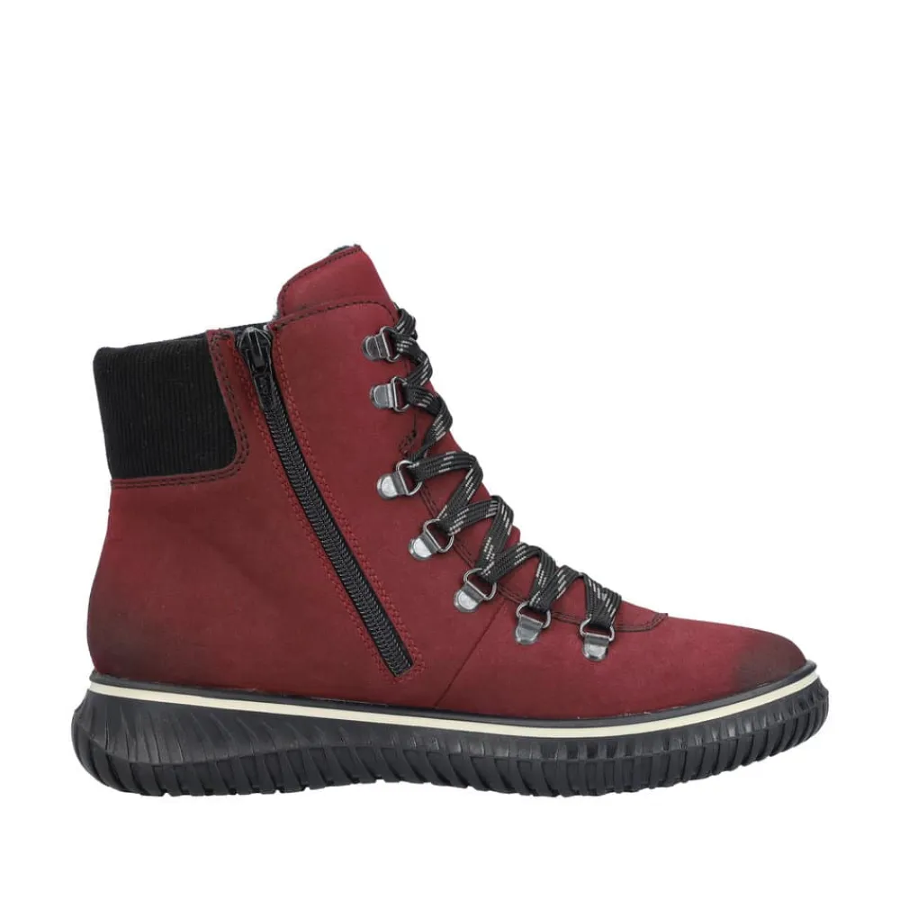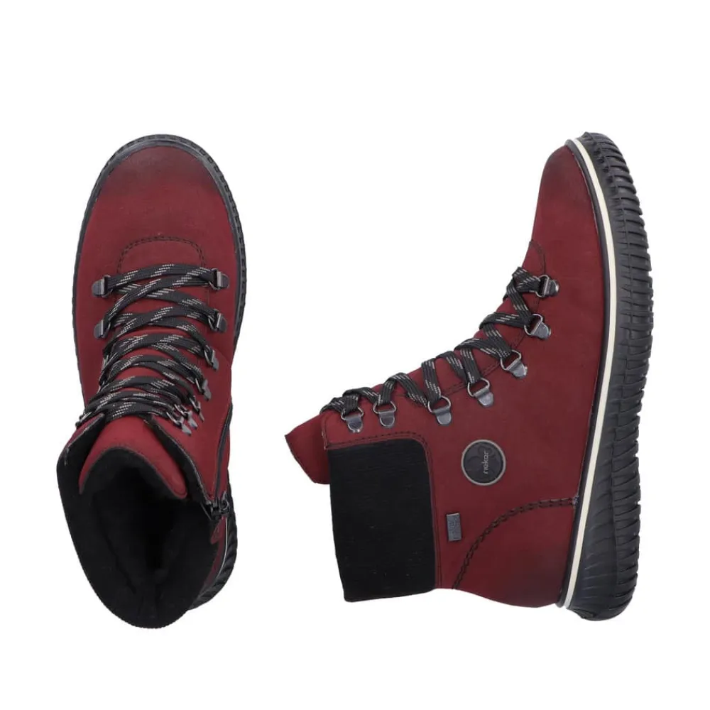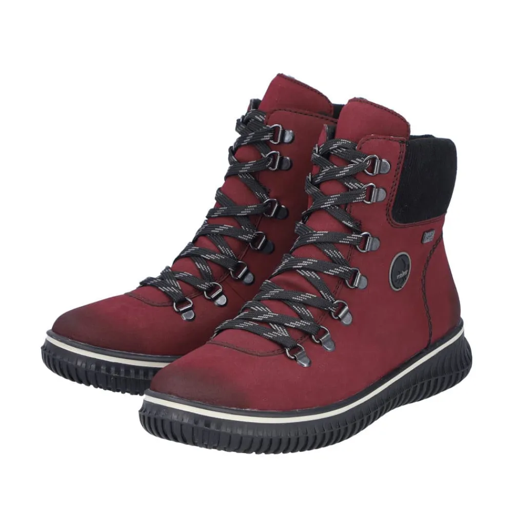 Rieker støvle til dame i rød. Denne støvle kombinerer stil og komfort perfekt med sin smukke røde farve og fine detaljer. Den er udstyret med en praktisk lynlås på indersiden samt snørebånd foran, som gør det hurtigt og nemt at tage støvlen på og af. Indvendigt har støvlen en varm foring, der holder fødderne lune på kolde dage. Udvendigt beskytter Rieker-Tex mod fugt og gør støvlen ekstra vandafvisende, så fødderne holdes tørre i al slags vejr. Indersålen er blød, kan tages ud og sikrer optimal komfort, mens den robuste ydersål med stødabsorbering giver støtte hele dagen.
