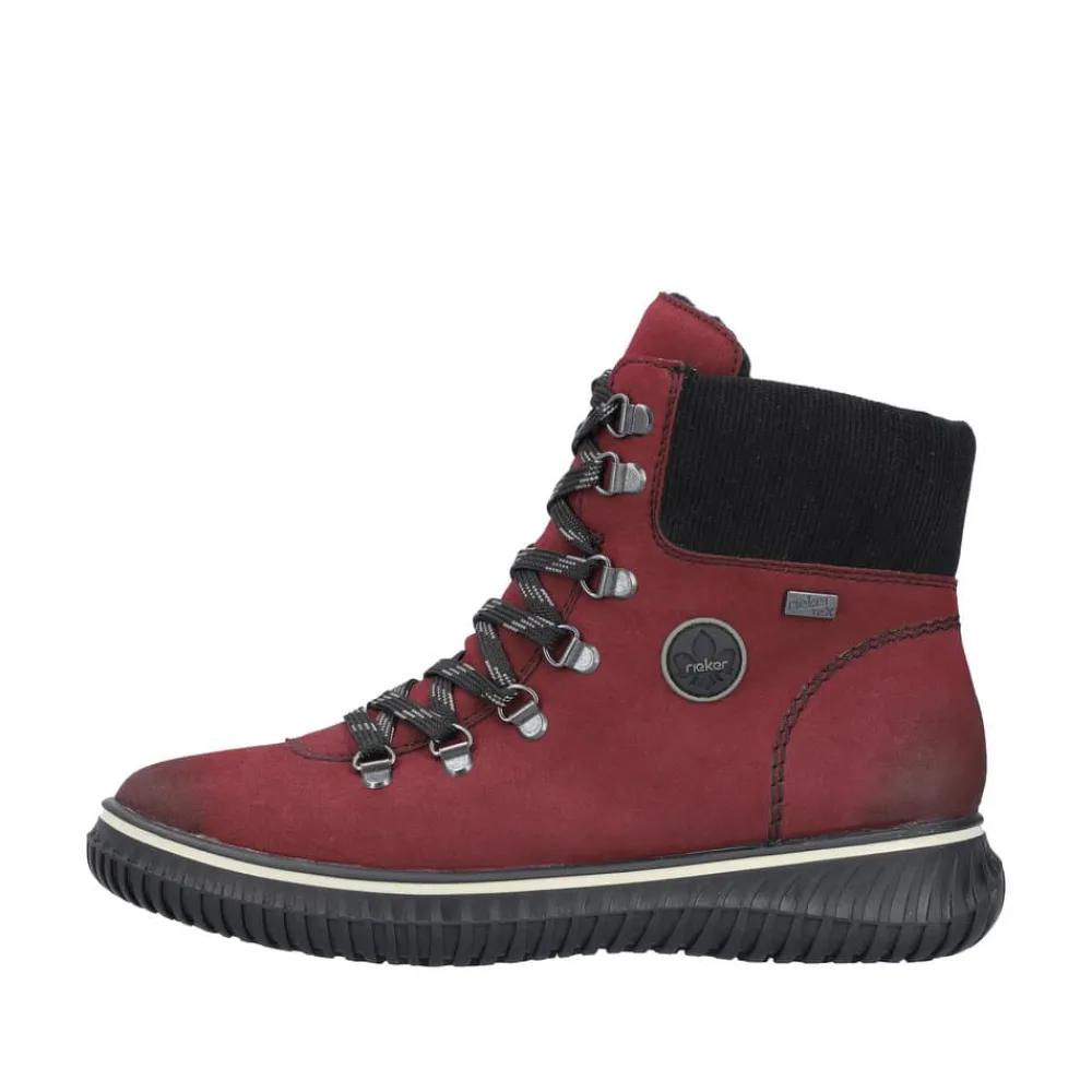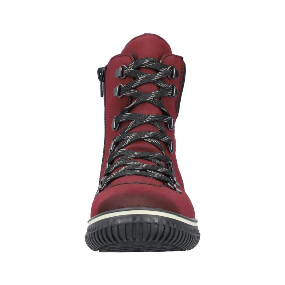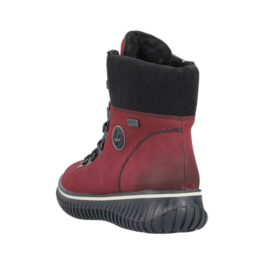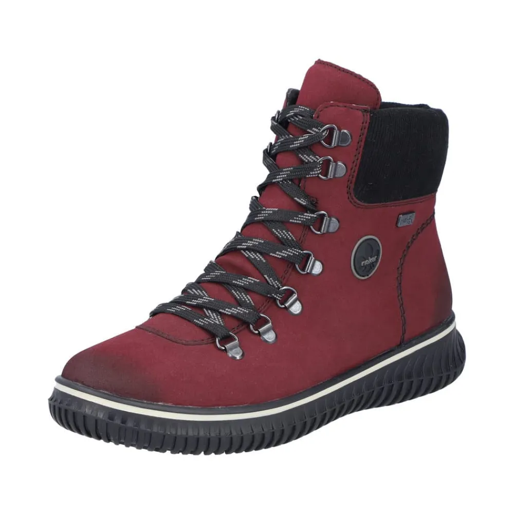 Rieker støvle til dame i rød. Denne støvle kombinerer stil og komfort perfekt med sin smukke røde farve og fine detaljer. Den er udstyret med en praktisk lynlås på indersiden samt snørebånd foran, som gør det hurtigt og nemt at tage støvlen på og af. Indvendigt har støvlen en varm foring, der holder fødderne lune på kolde dage. Udvendigt beskytter Rieker-Tex mod fugt og gør støvlen ekstra vandafvisende, så fødderne holdes tørre i al slags vejr. Indersålen er blød, kan tages ud og sikrer optimal komfort, mens den robuste ydersål med stødabsorbering giver støtte hele dagen.