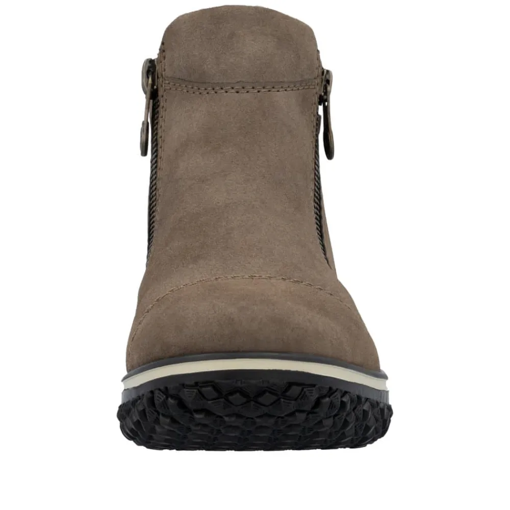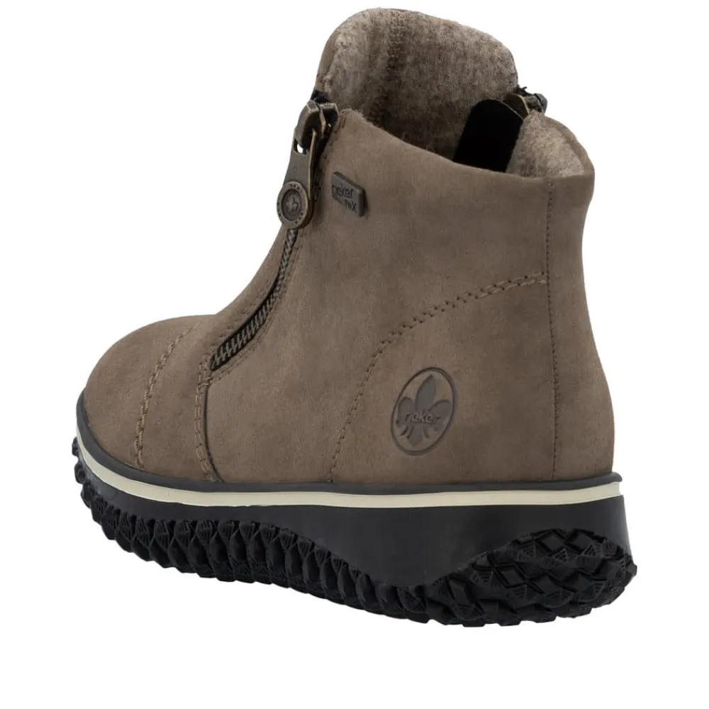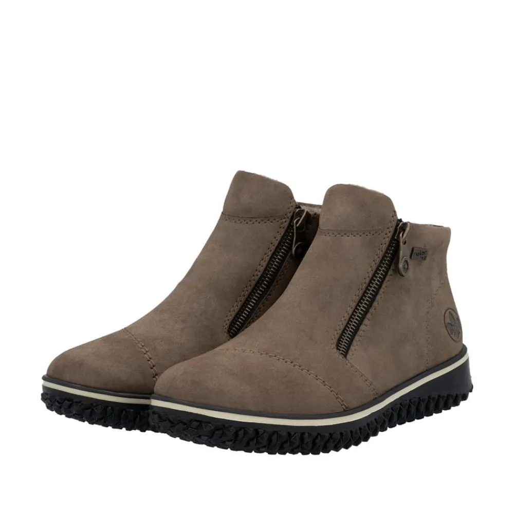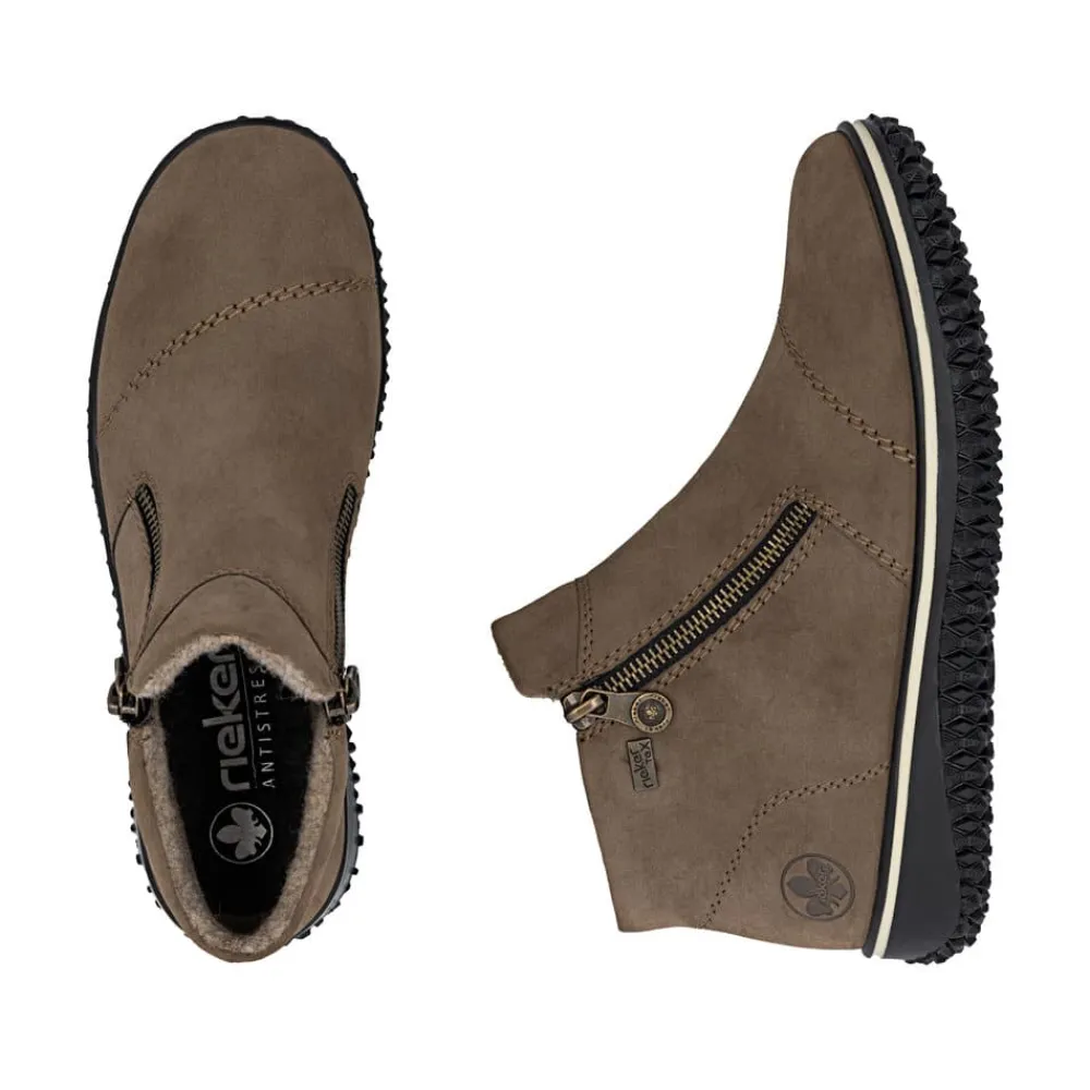 Rieker støvle til dame i brun. Denne støvle er perfekt til hverdagen og kombinerer praktiske detaljer med høj komfort. Modellen har to funktionelle lynlåse, der gør modellen nem at tage af og på. Indvendigt finder du en blød indersål og en varm foring, som giver behagelig komfort hele dagen. Rieker-Tex gør støvlen kraftigt vandafvisende, mens den mønstrede ydersål øger både stødabsorbering og skridsikkerhed.