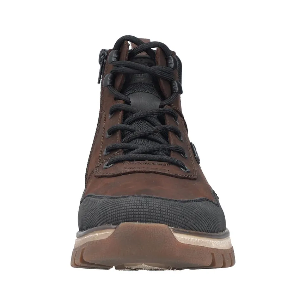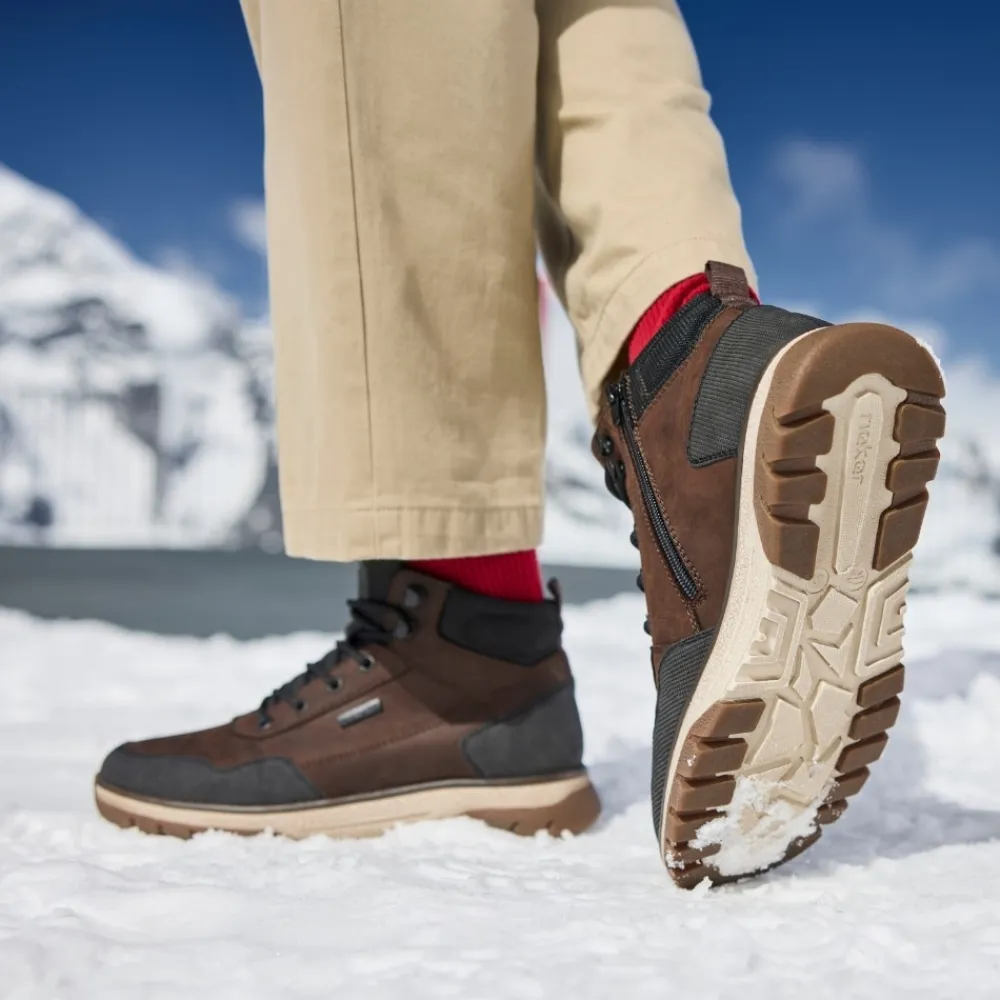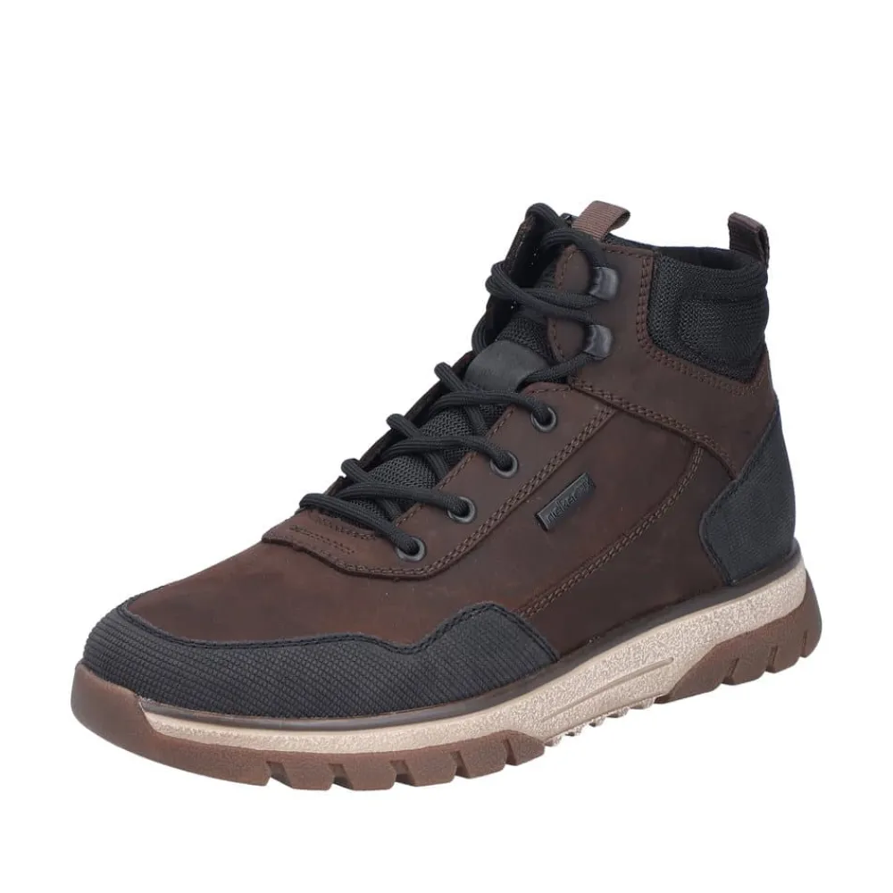 Rieker støvle til herre i mørkebrun. Med denne støvle i skind får du en kombination af moderne design og høj komfort. Snørebåndene foran giver mulighed for at justere pasformen, mens lynlåsen på indersiden gør det nemt at tage støvlen på. Indvendigt sørger en varm foring og en blød udtagelig sål for komfort hele dagen, og den ekstra bredde (H) giver foden mere plads og fleksibilitet. Støvlen er desuden udstyret med Rieker-Tex som gør støvlen kraftig vandafvisende, mens den mønstrede ydersål giver øget stødabsorbering og skridsikkerhed.