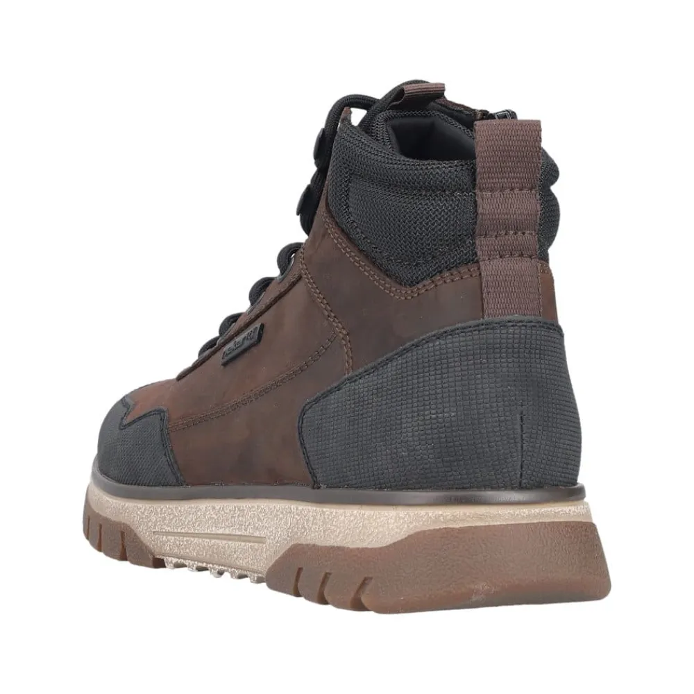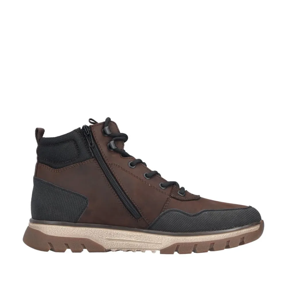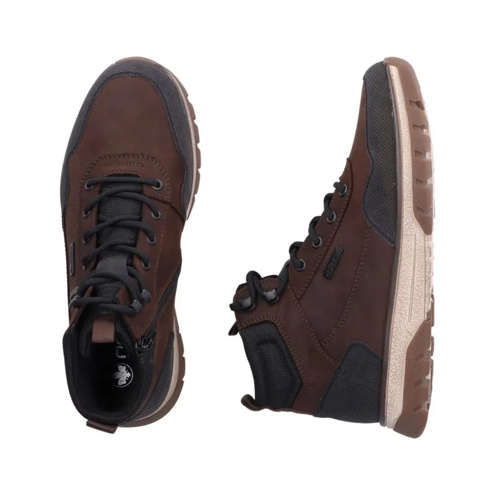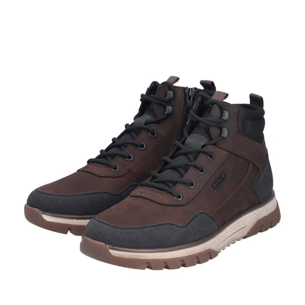 Rieker støvle til herre i mørkebrun. Med denne støvle i skind får du en kombination af moderne design og høj komfort. Snørebåndene foran giver mulighed for at justere pasformen, mens lynlåsen på indersiden gør det nemt at tage støvlen på. Indvendigt sørger en varm foring og en blød udtagelig sål for komfort hele dagen, og den ekstra bredde (H) giver foden mere plads og fleksibilitet. Støvlen er desuden udstyret med Rieker-Tex som gør støvlen kraftig vandafvisende, mens den mønstrede ydersål giver øget stødabsorbering og skridsikkerhed.