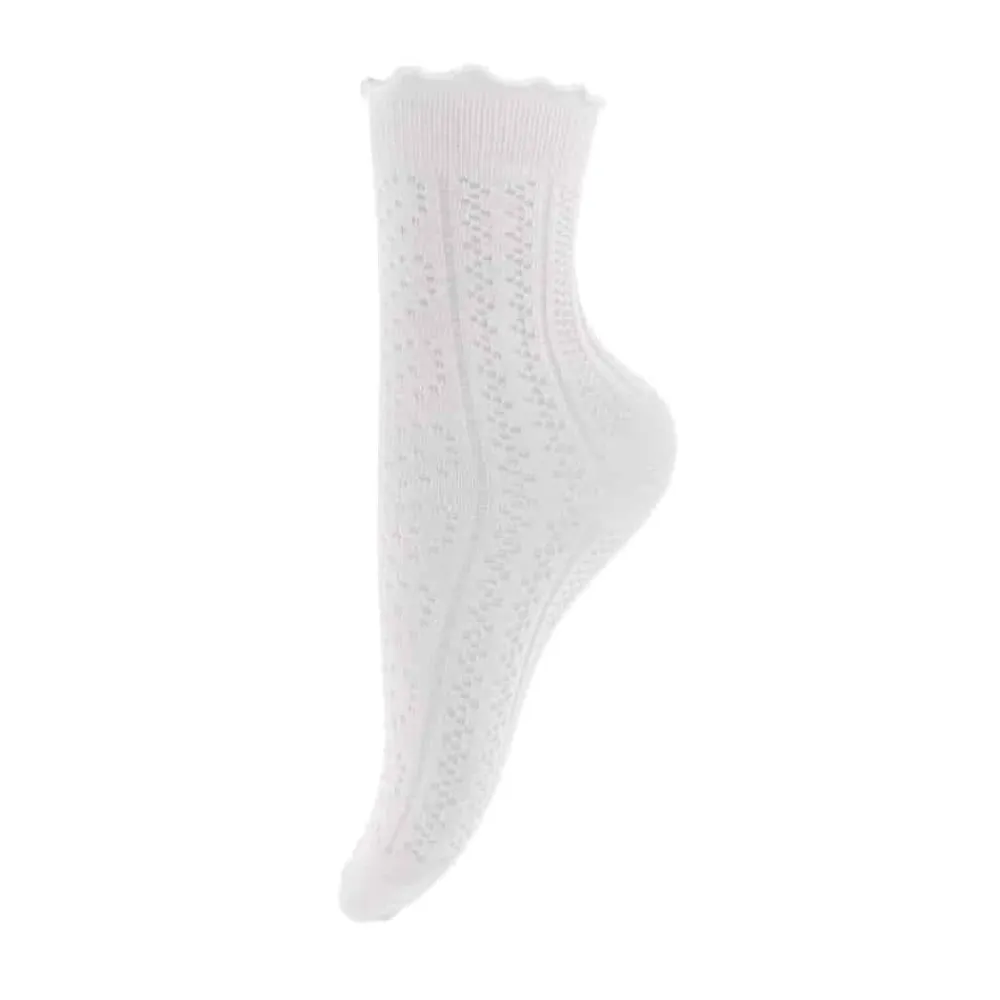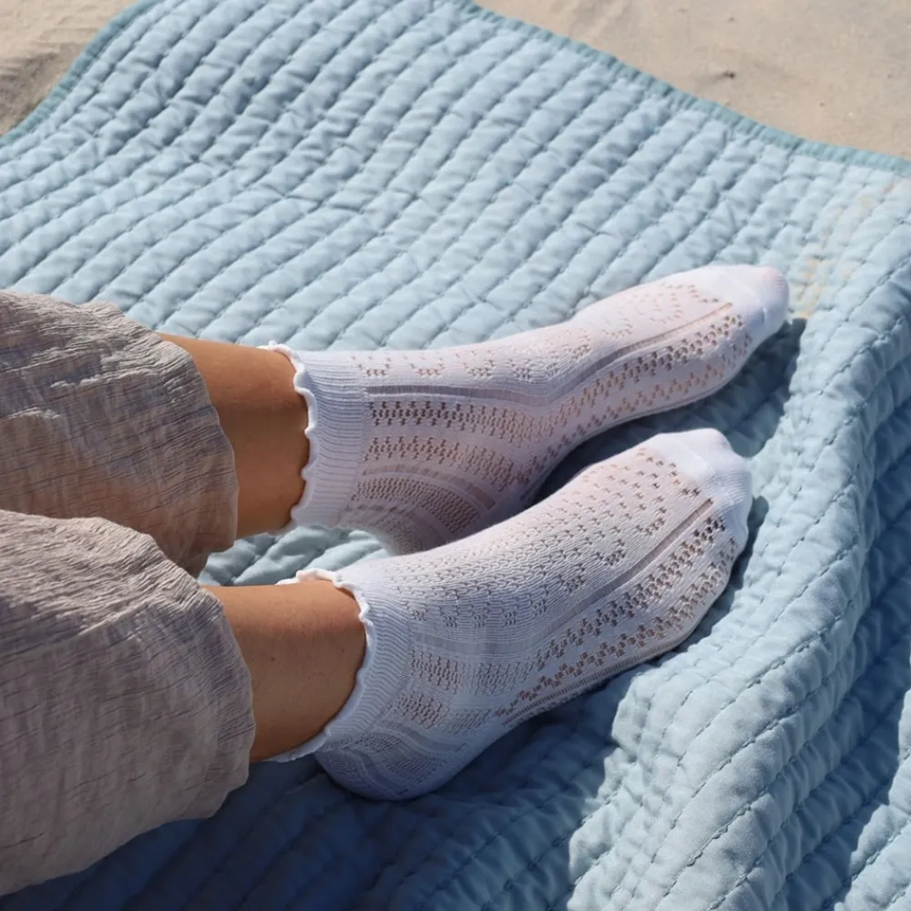 By Stær strømper til dame i hvid. Disse fine strømper med flæser er det perfekte valg til sommerens sneakers og sandaler. Det unikke design og de charmerende detaljer tilfører et elegant og stilfuldt touch til ethvert outfit. Med 80% bomuld er den komfortabel, åndbar og blød, mens 20% polyester giver øget slidstyrke. Strømpen kan maskinvaskes ved 30°C og er et praktisk valg til både hverdag og særlige anledninger.