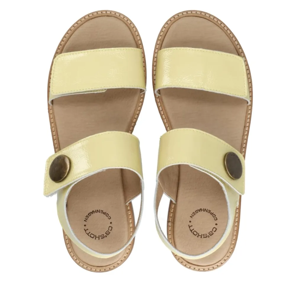 Cashott Casgrace sandal til dame i gul lak. Smuk gul laksandal med et moderne design og to velcroremme, der sikrer en justerbar og komfortabel pasform. Sandalen er fremstillet af skind, mens en elegant gylden knap på remmen tilfører et eksklusivt touch. Den bløde indersål giver en behagelig oplevelse hele dagen, og den solide rågummisål sikrer stabilitet og skridsikkerhed. Med en lille hæl på ca. 3,5 cm får du et stilfuldt løft uden at gå på kompromis med komforten.