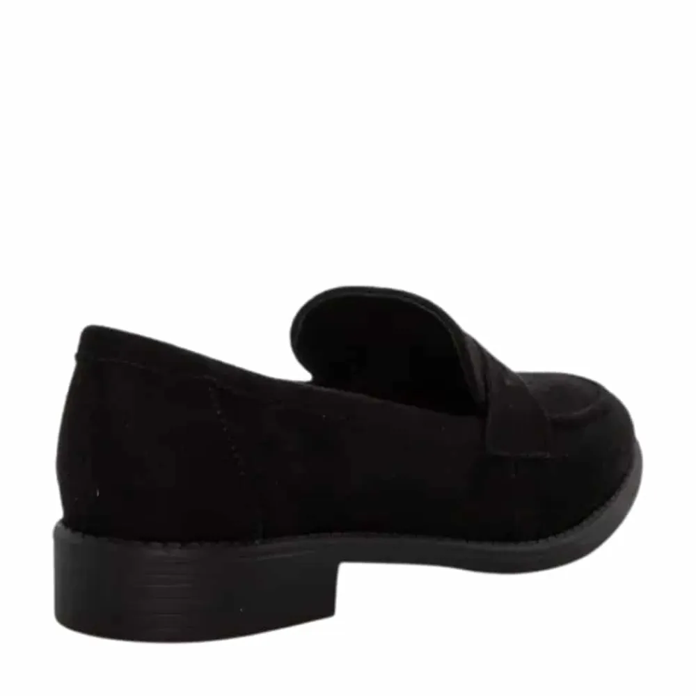 Duffy Francica Cinque loafers til dame i sort. Med sin klassiske sorte farve og enkle design er denne loafers et sikkert valg til mange anledninger. Den lille hæl på 3 cm giver en let løft, mens detaljen over forfoden giver et elegant look. Den bløde indersål gør skoen behagelig at gå med, og den er let at tage af og på.