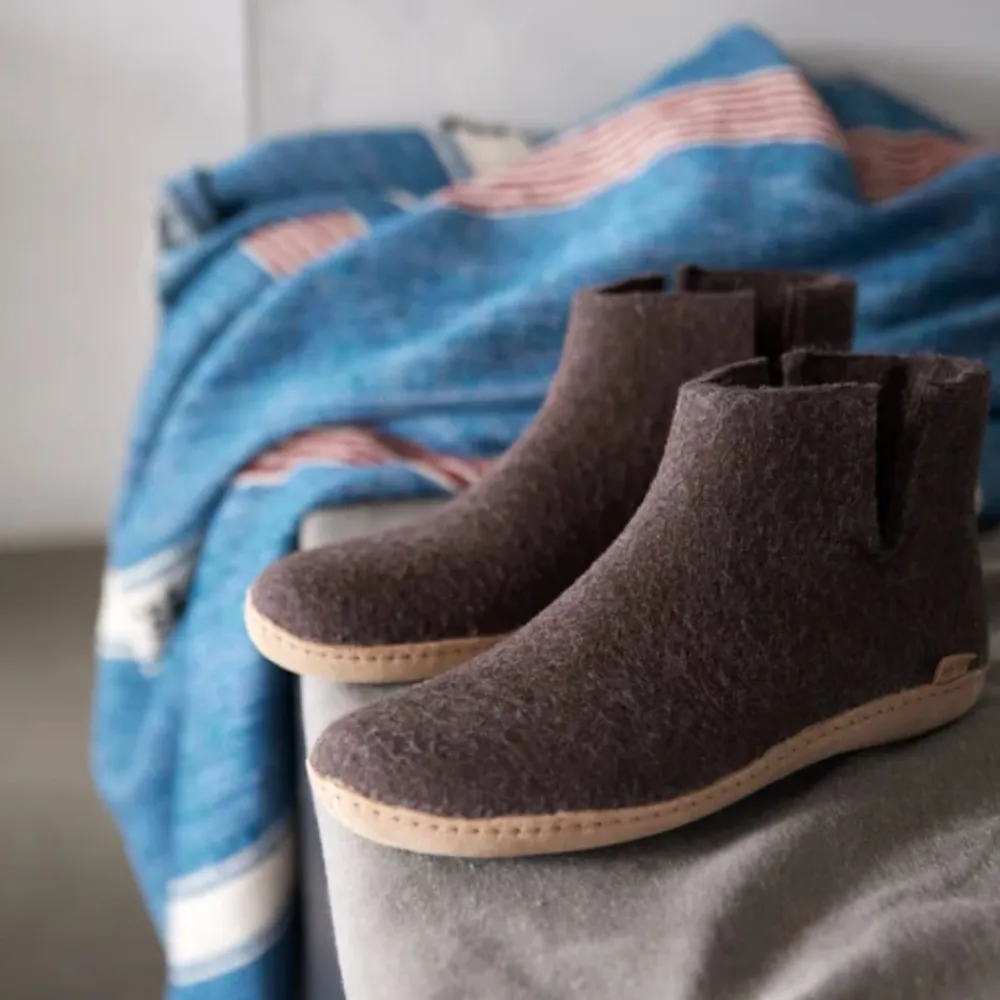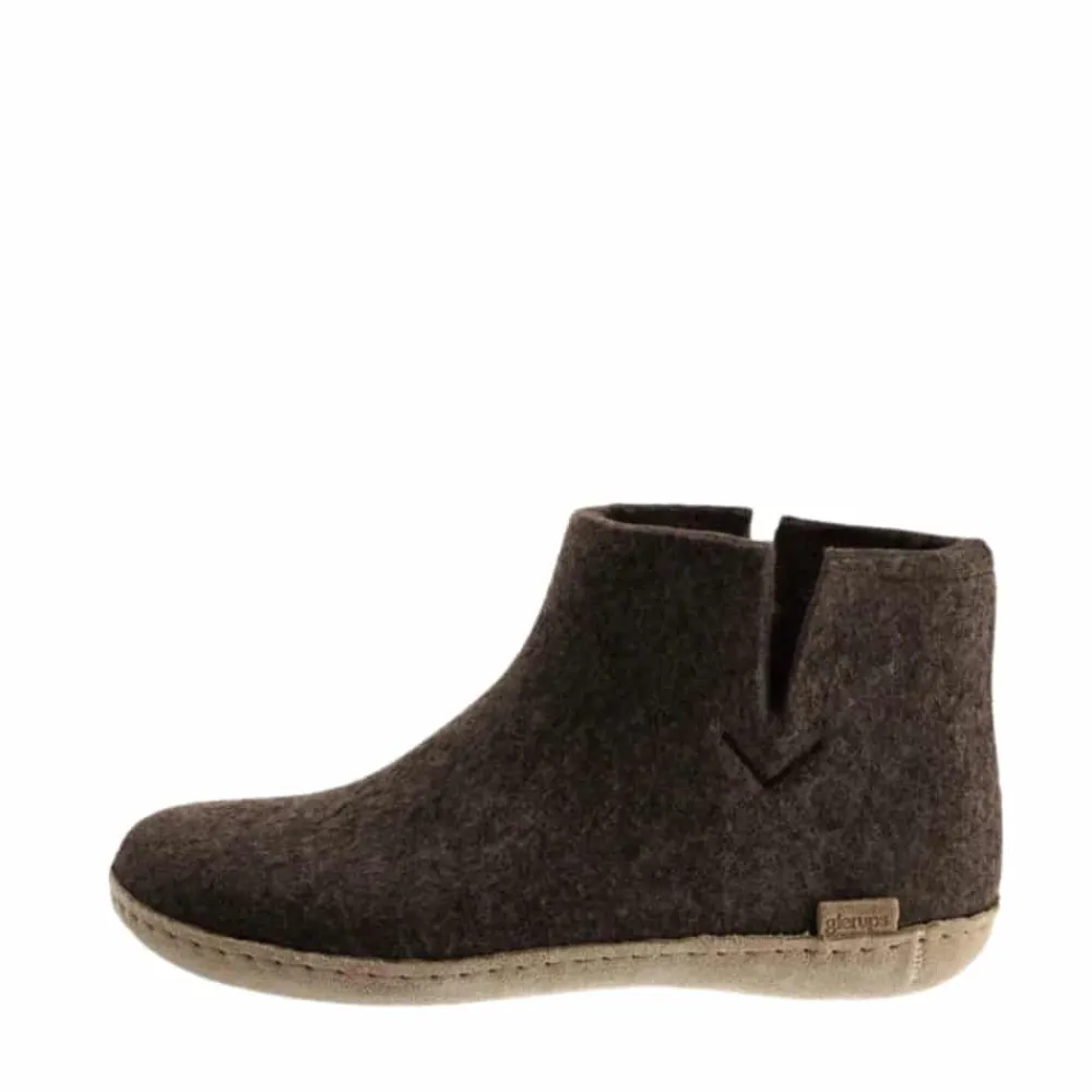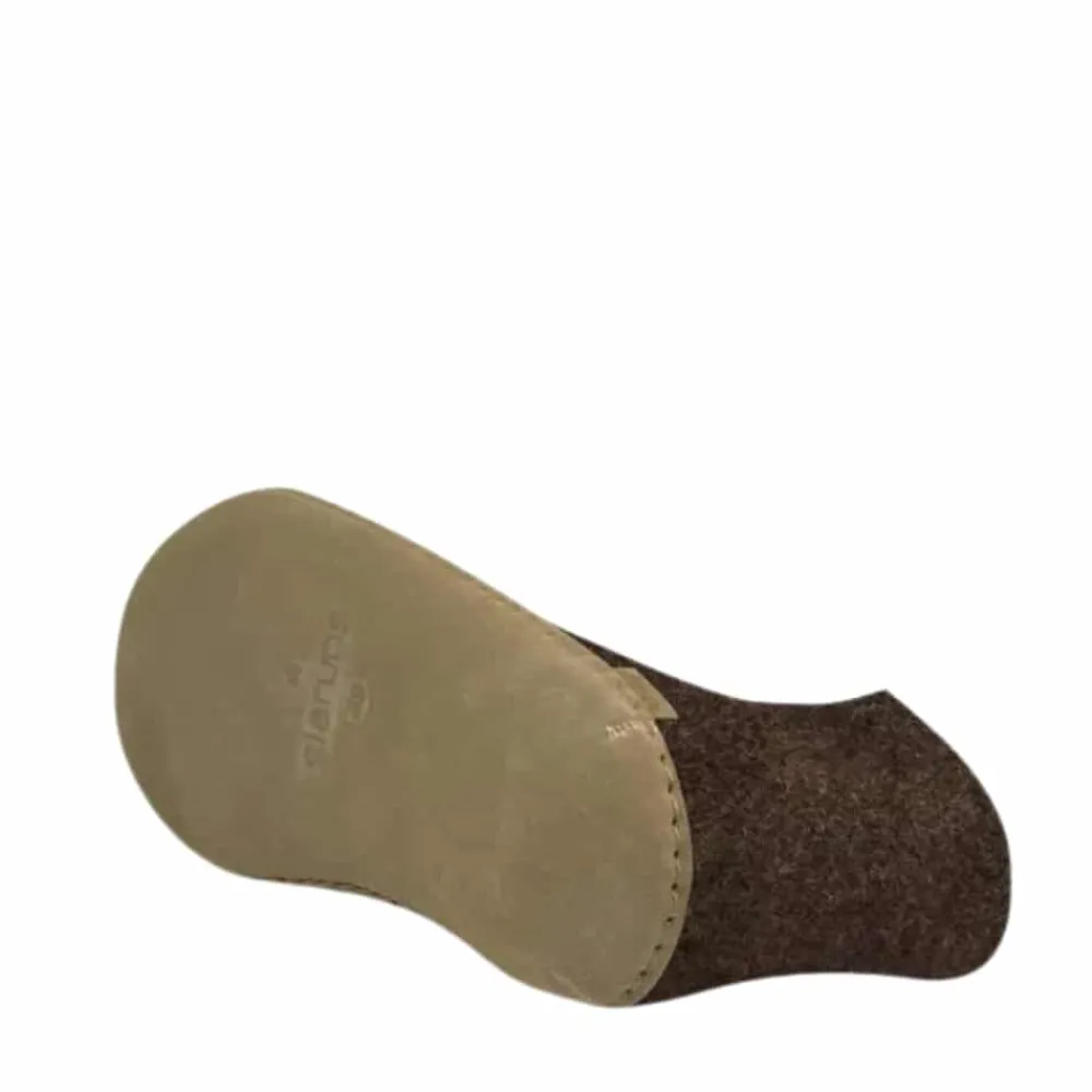 Glerups hjemmesko til dame og herre i brun. Denne hjemmesko er designet i 100% naturlig uld, som giver både komfort og varme. Det enkle ankeldesign sørger for en behagelig pasform, der omslutter foden og giver optimal støtte. Hjemmeskoen er fleksibel og tilpasser sig fodens naturlige bevægelser, mens uldens egenskaber holder fødderne varme. Ydersålen er fremstillet i kalveskind, hvilket giver en naturlig holdbarhed.