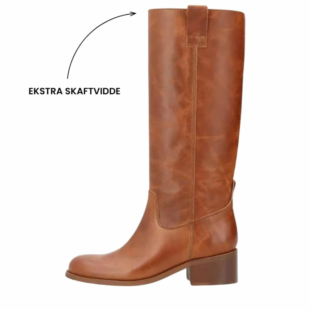 Phenumb Copenhagen Martina Wix lang støvle til dame i cognac. Flot og moderne støvle med ekstra skaftvidde, der giver en god og komfortabel pasform til dig med brede lægge. Støvlen er fremstillet i 100% kernelæder, som er blødt og bliver smukkere med tiden. Indvendigt har støvlen glatskind og en blød indersål, der giver behagelig støtte dagen igennem. Den chunky hæl på 5 cm giver et elegant løft, mens det tidløse design gør støvlen ideel til enhver lejlighed.