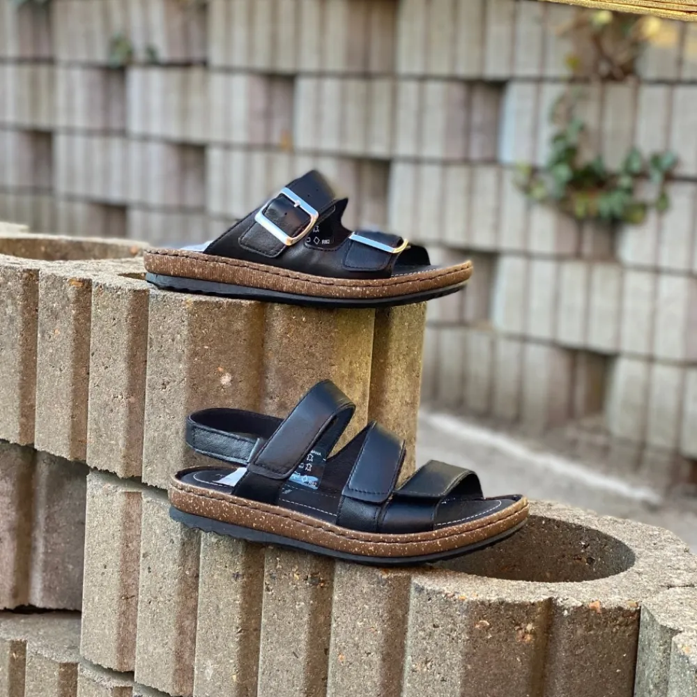 Relaxshoe sandal til dame i sort. Denne stilfulde sandal er designet med et klassisk design, der fungerer godt til både hverdag og festlige anledninger. Sandalen er lavet af 100% skind og har fire justerbare velcroremme, der sikrer en behagelig og individuel pasform. Indvendigt byder den bløde indersål på høj komfort, mens den slidstærke og skridsikre sål giver sikkerhed og støtte hele dagen.