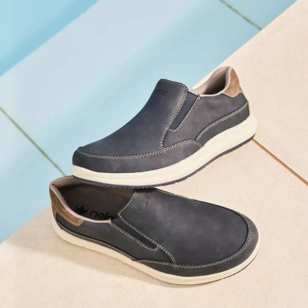 Rieker hyttesko til herre i blå. Denne klassiske hyttesko fra Rieker kombinerer stil og komfort i én sko. Med en overdel i ægte skind og elastiske sider er den nem at tage på og af. Den ekstra vidde H giver mere plads til brede fødder, hvilket sikrer en behagelig pasform hele dagen. Rieker Antistress-teknologien og den stødabsorberende sål reducerer belastningen på fødderne, mens den udtagelige bløde indlægssål giver ekstra komfort. Perfekt til både hverdagsbrug og mere afslappede anledninger.