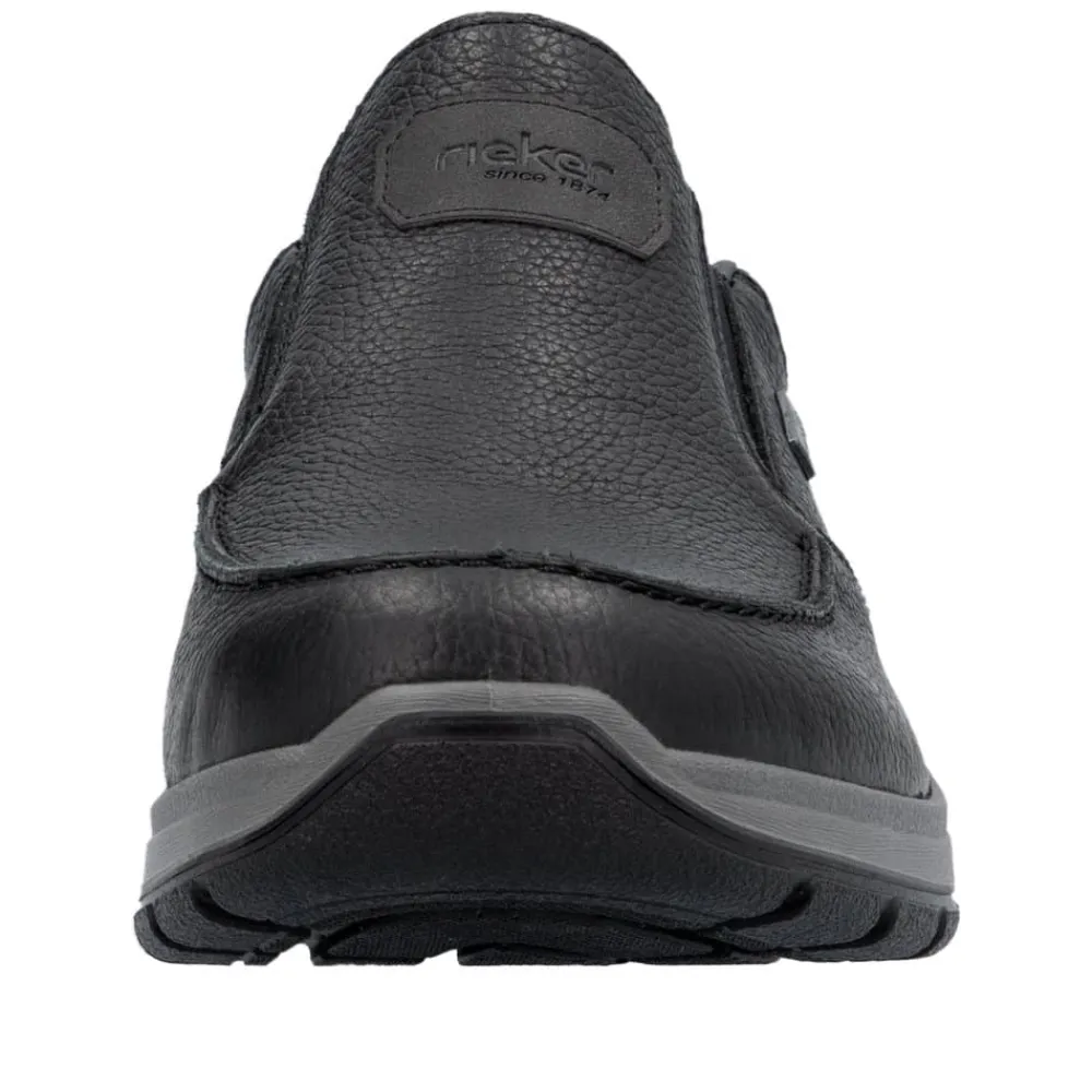 Rieker hyttesko til herre i sort. Elegant og praktisk hyttesko med en sort skindoverdel, der løfter kvaliteten og udseendet på skoen. De to elastikker gør det let at tage skoen af og på, hvilket sikrer en hurtig og nem pasform. Skoen har flotte detaljer som Rieker logoet foran og brune detaljer bagpå, der giver et stilfuldt touch. Udstyret med Rieker-Tex er modellen vandafvisende, så dine fødder holdes tørre i al slags vejr. Indersålen er blød og kan tages ud, mens den ekstra vidde sikrer optimal komfort hele dagen. Den solide ydersål har et godt mønster, der giver ekstra skridsikkerhed og støtte, sammen med Rieker Antistress-teknologien.
