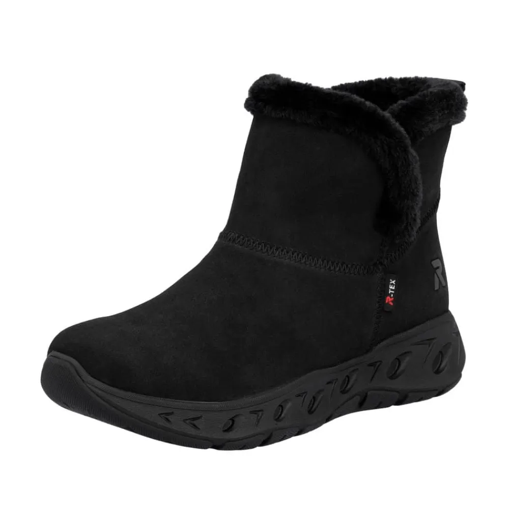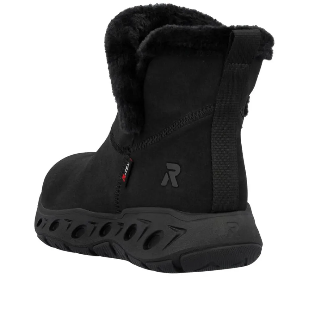 Rieker Ready 2 Go støvle til dame i sort. Smart sort støvle, der på bedste vis kombinerer stil og funktionalitet. Med Ready 2 Go teknologi og en fast hælkappe kan du tage støvlen på uden brug af hænder, hvilket gør støvlen både praktisk og nem i hverdagen. Indvendigt sørger den varme foring og den bløde Memosoft sål for en behagelig komfort hele dagen. Støvlen er desuden udstyret med Rieker-Tex, som gør støvlen kraftig vandafvisende, mens den mønstrede ydersål giver øget stødabsorbering og skridsikkerhed.