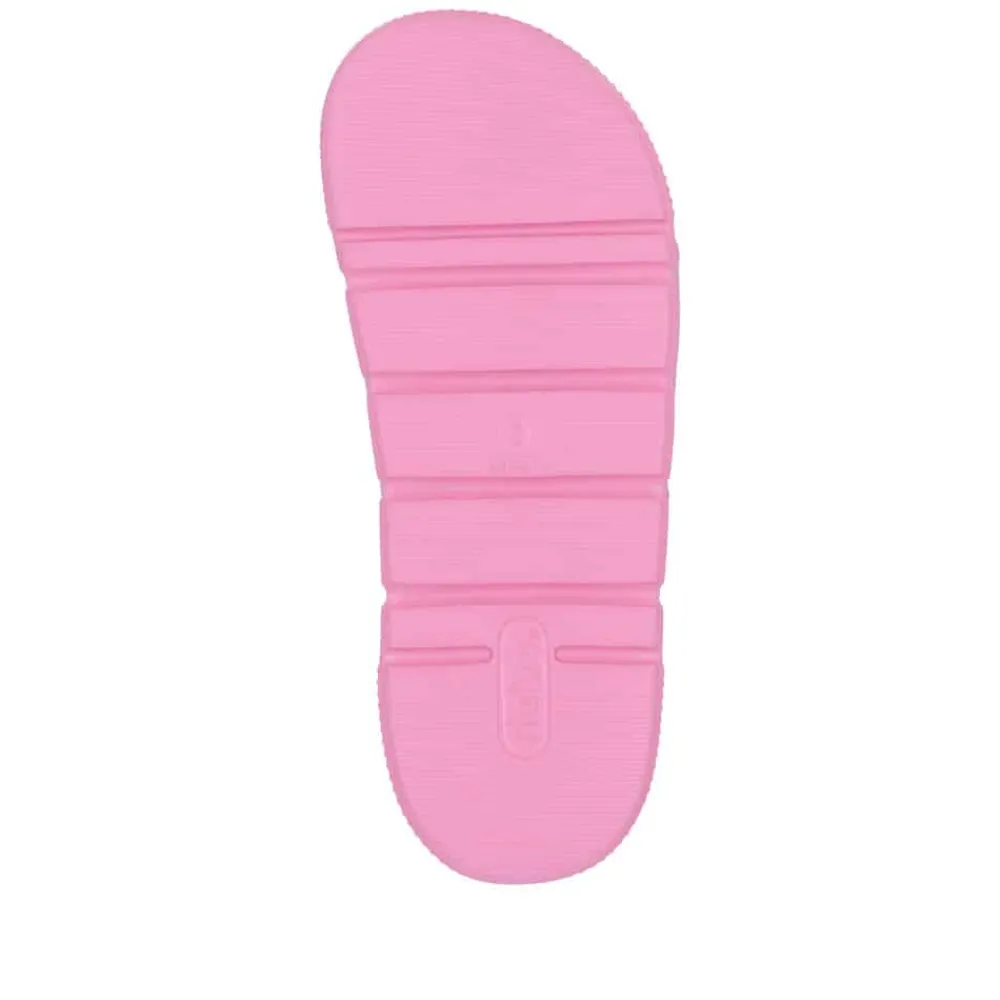 Rieker sandal til dame i pink. Denne moderne sandal i en frisk pink farve kombinerer klassisk design med funktionel komfort. De to justerbare spænder gør det nemt at tilpasse pasformen, mens slip-in funktionen sikrer, at du hurtigt kan tage sandalen af og på. Den bløde indersål giver en behagelig følelse hele dagen, og den chunky EVA-ydersål på 4,5 cm sørger for god støtte. Med stødabsorberende egenskaber og en mønstret sål får du både komfort og skridsikkerhed i ét stilfuldt design.