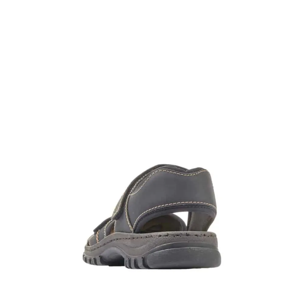 Rieker sandal i sort til herre. Denne sandal er det optimale valg for mænd, der søger stil, komfort og holdbarhed. Designet med fokus på detaljer og funktionalitet gør den ideel til afslappede sommerdage og udendørs eventyr. Det robuste design og kvalitetsmaterialer sikrer holdbarhed og alsidighed. Sandalen har gode stødabsorberende såler, som gør den super god at gå i. Dertil har sandalen en god pasform, og giver mulighed for at justere med de to velcro remme henover foden.