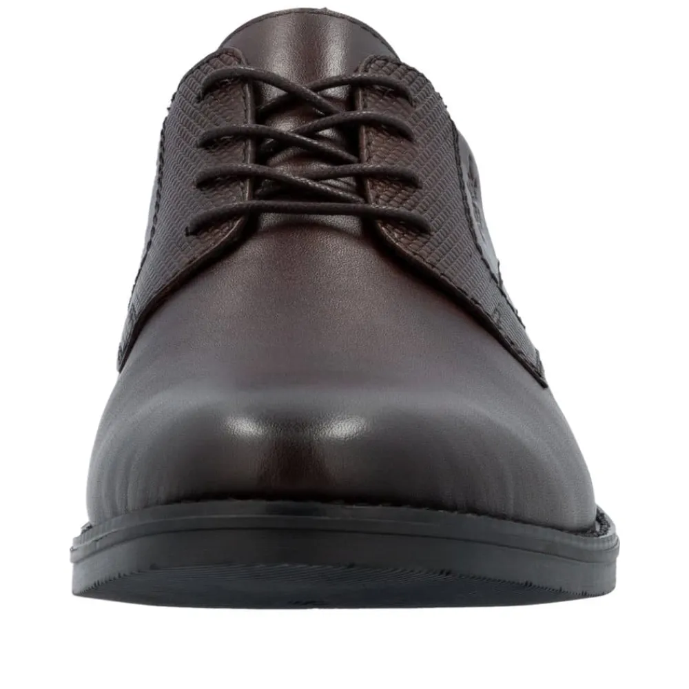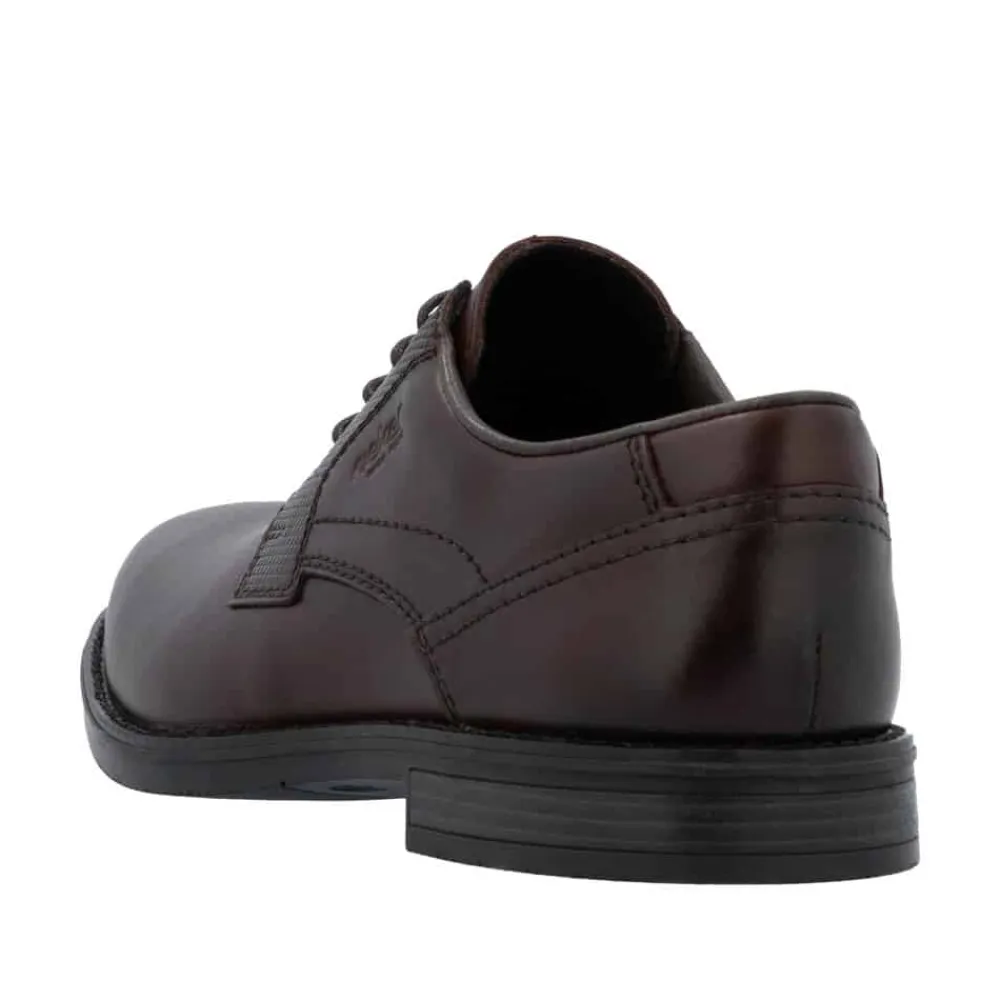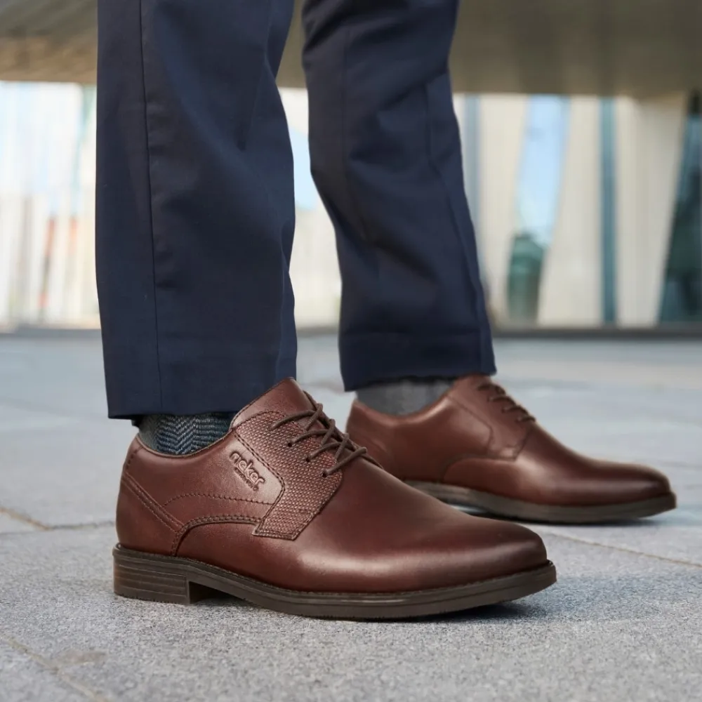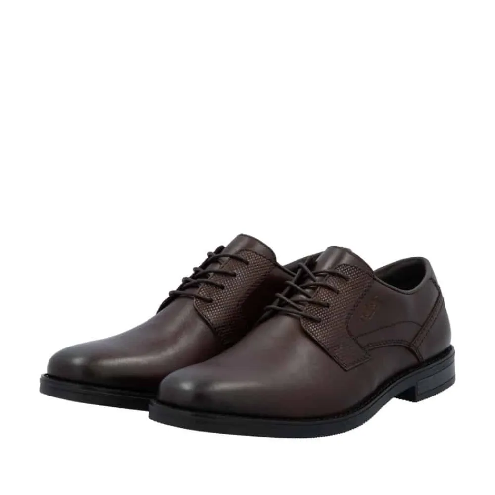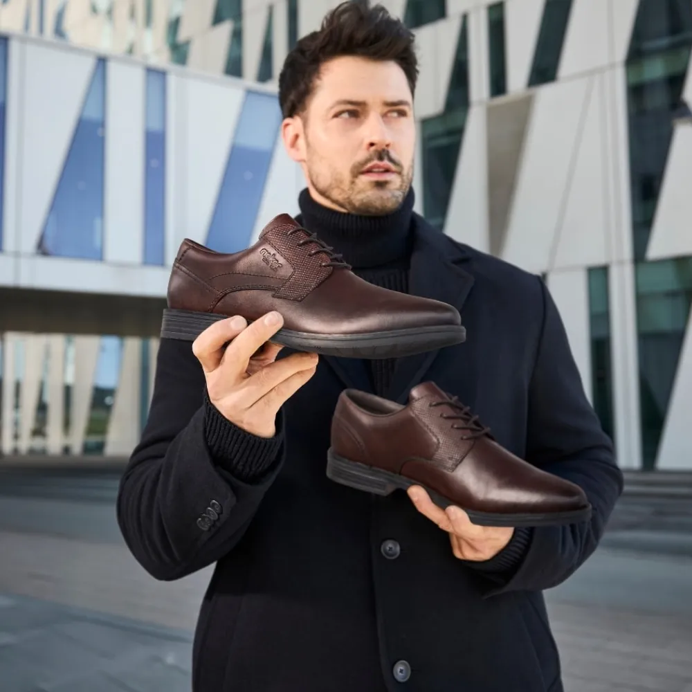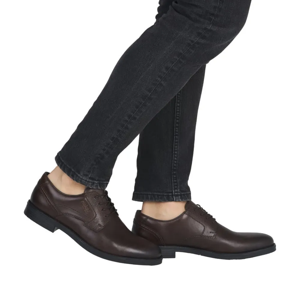 Rieker sko til herre i mørkebrun. klassisk og komfortabel herresko med en blød skindoverdel, der sikrer en behagelig pasform. Skoen er udstyret med snørebånd, så du kan justere skoen præcist til din fod. Indvendigt finder du en blød sål samt ekstra bredde (G), der giver både komfort og rummelighed. Ydersålen med mønster giver øget stødabsorbering og skridsikkerhed.