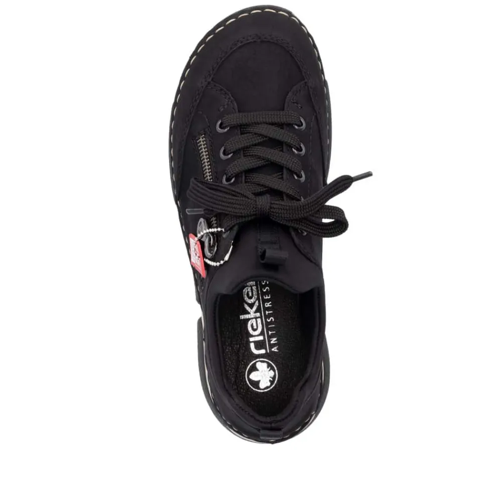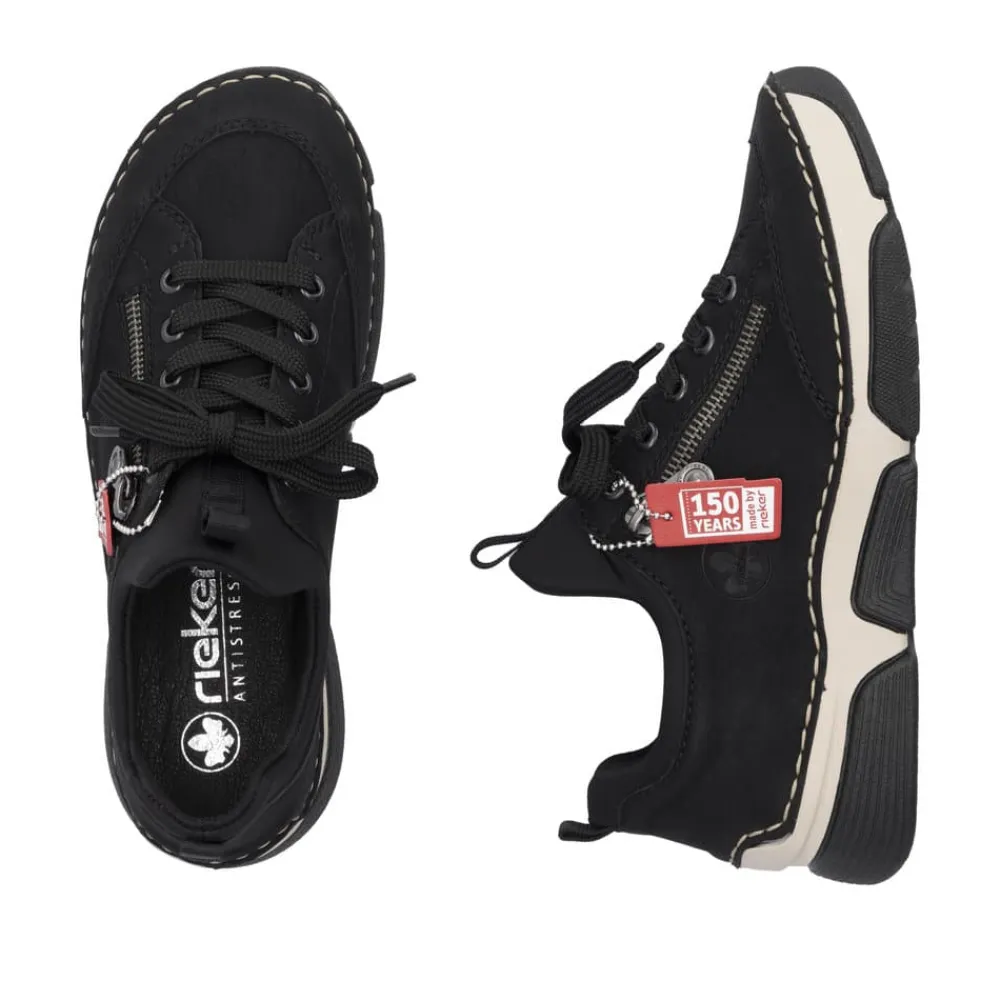 Rieker sneakers til dame i sort. Denne sorte sneakers er let og fleksibel og kombinerer komfort med et stilrent udtryk. Skoen har en pynte lynlås på siden, der giver et enkelt og moderne look. Den elastiske åbning gør det nemt at komme i skoen, mens snørebåndet giver mulighed for at justere pasformen, så den sidder præcis som den skal. Indersålen er lavet i blødt skind og sørger for støtte og komfort hele dagen. Ydersålen er stødabsorberende og følger dine bevægelser, så du får en behagelig oplevelse hver gang du tager et skridt.