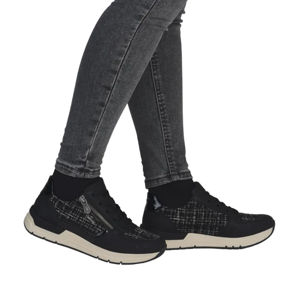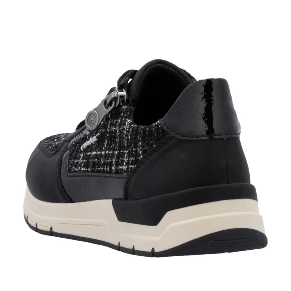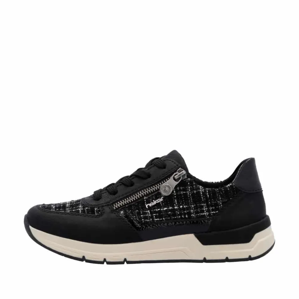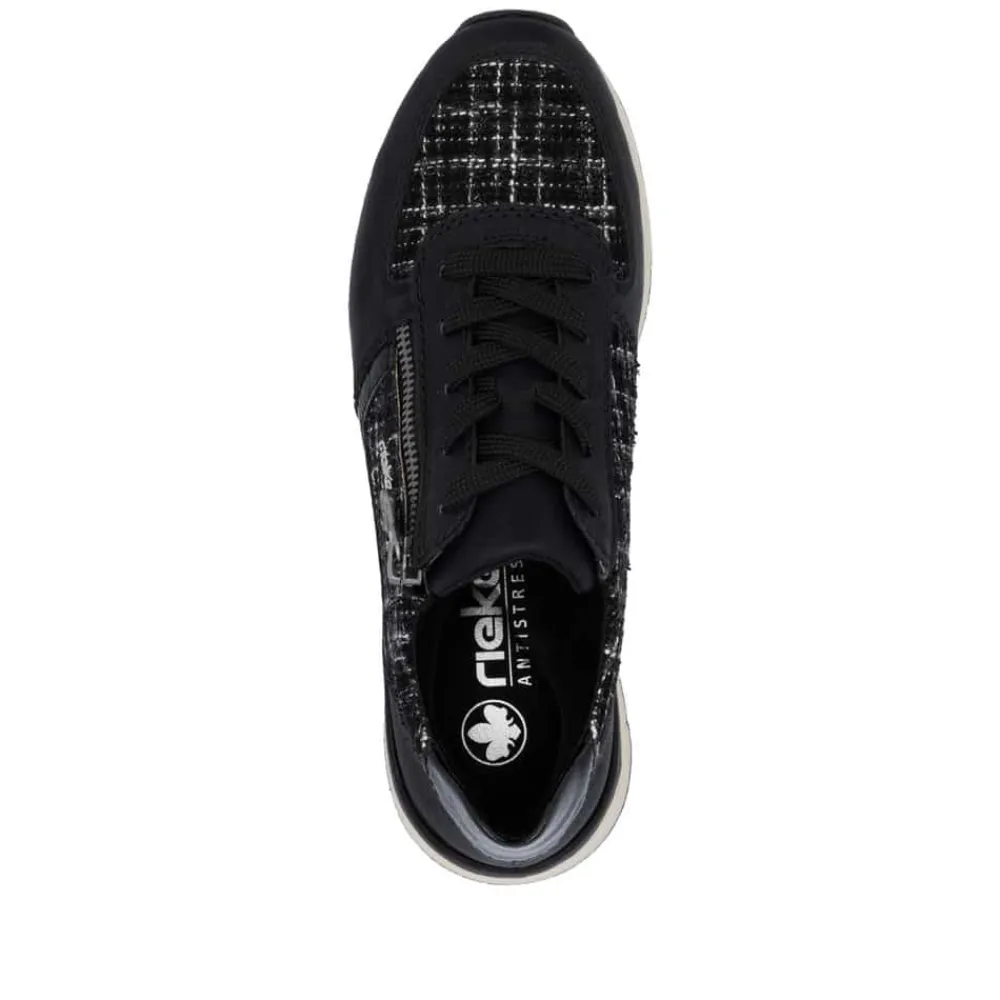 Rieker sneakers til dame i sort. Moderne sneakers i en flot sort farve med fede detaljer der giver et feminint look. Skoene har både snørebånd og en praktisk lynlås i siden, så de er nemme at tage af og på. Indvendigt bliver du mødt af en blød og udtagelig indersål, der sikrer komfort hele dagen. Den lette og fleksible ydersål med Rieker Antistress-teknologi gør skoene ideelle til hverdagens aktiviteter.