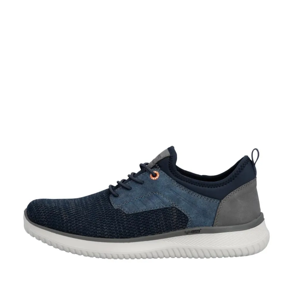 Rieker sneakers til herre i blå. Moderne sneakers til dig, der ikke vil gå på kompromis med hverken stil eller komfort. Modellen er udstyret med elastik foran, som giver en behagelig pasform og gør skoen nem i hverdagen. Indvendigt mødes foden af en blød sål samt ekstra bredde (G), der sikrer høj komfort og god rummelighed hele dagen. Ydersålen har et mønster, som giver øget stødabsorbering og skridsikkerhed ved hvert skridt.