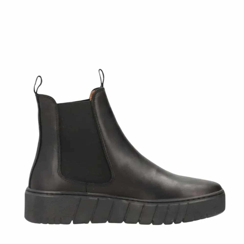 Shoedesign Copenhagen Mooved BLK støvle til dame i sort. Elegant sort chelseastøvle i glatskind, der kombinerer klassisk design med komfort. De elastiske sider gør det nemt og hurtigt at tage støvlen af og på, mens den bløde skindsål indvendigt giver behagelig støtte hele dagen. Med en kilehæl på ca. 4 cm får du et feminint løft, og den sorte gummisål med mønster giver både støtte og øget skridsikkerhed.