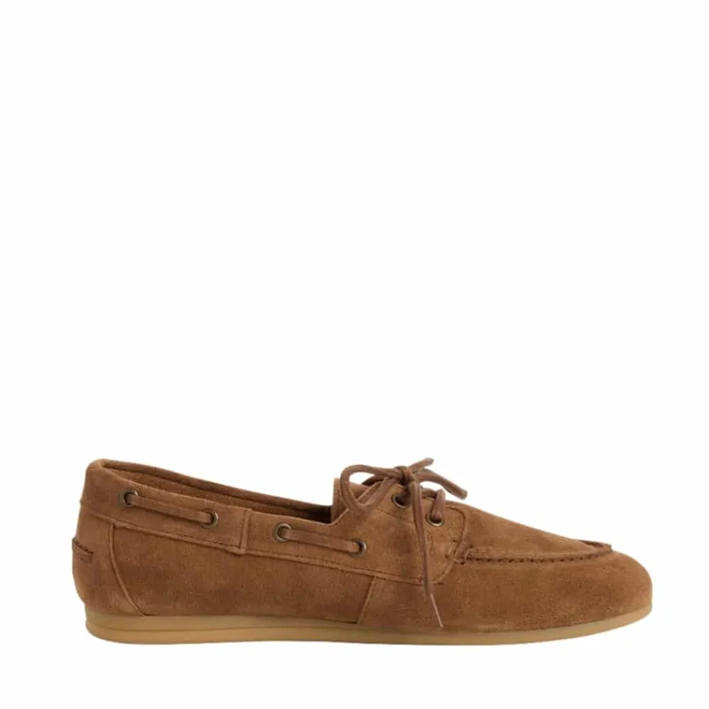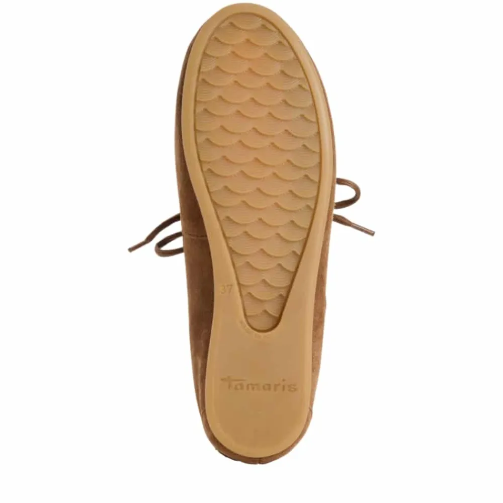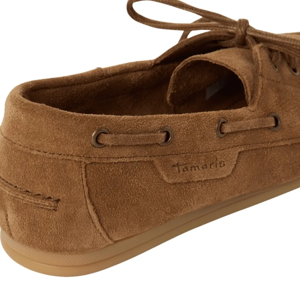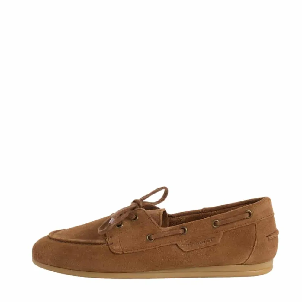 Tamaris sejlersko til dame i brun. Denne stilfulde sejlersko har en flot farve med blød ruskindsoverdel og fine detaljer, som giver et moderne udtryk. Skoen har snøredetaljer langs siden for et klassisk sejlersko look, mens snørebåndet foran gør det muligt at justere pasformen. Indvendigt er skoen udstyret med en blød indersål i skind, som giver god komfort. Ydersålen er let og fleksibel og har et mønster, der bidrager til øget skridsikkerhed.