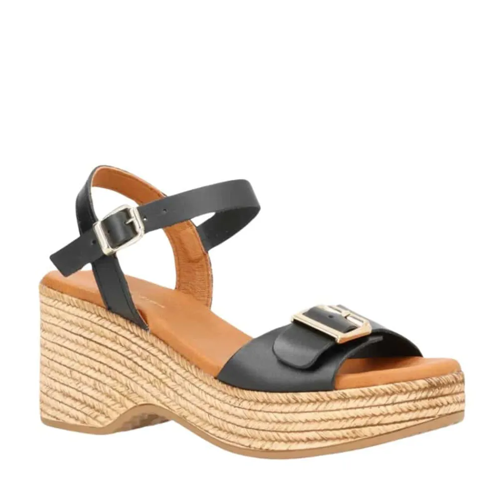 Shoedesign Copenhagen Lourdes sandal til dame i sort. Moderne sandal i en smuk sort farve, med et smukt design. Sandalen har nemlig en plateausål med et twist af en kilehæl, der pyntes af flotte fletdetaljer på siden og måler ca 7,5 cm. Den tykke sål sikrer en god komfort, da foden får støtte og du er derfor sikret optimal komfort dagen lang. Sandalen har desuden en bred rem ved forfoden, som pyntes af en justerbar guldspænde. Med guldspænde ved forfoden samt en justerbar spænde ved anklen, kan du nemt tilpasse sandalen til dine behov.